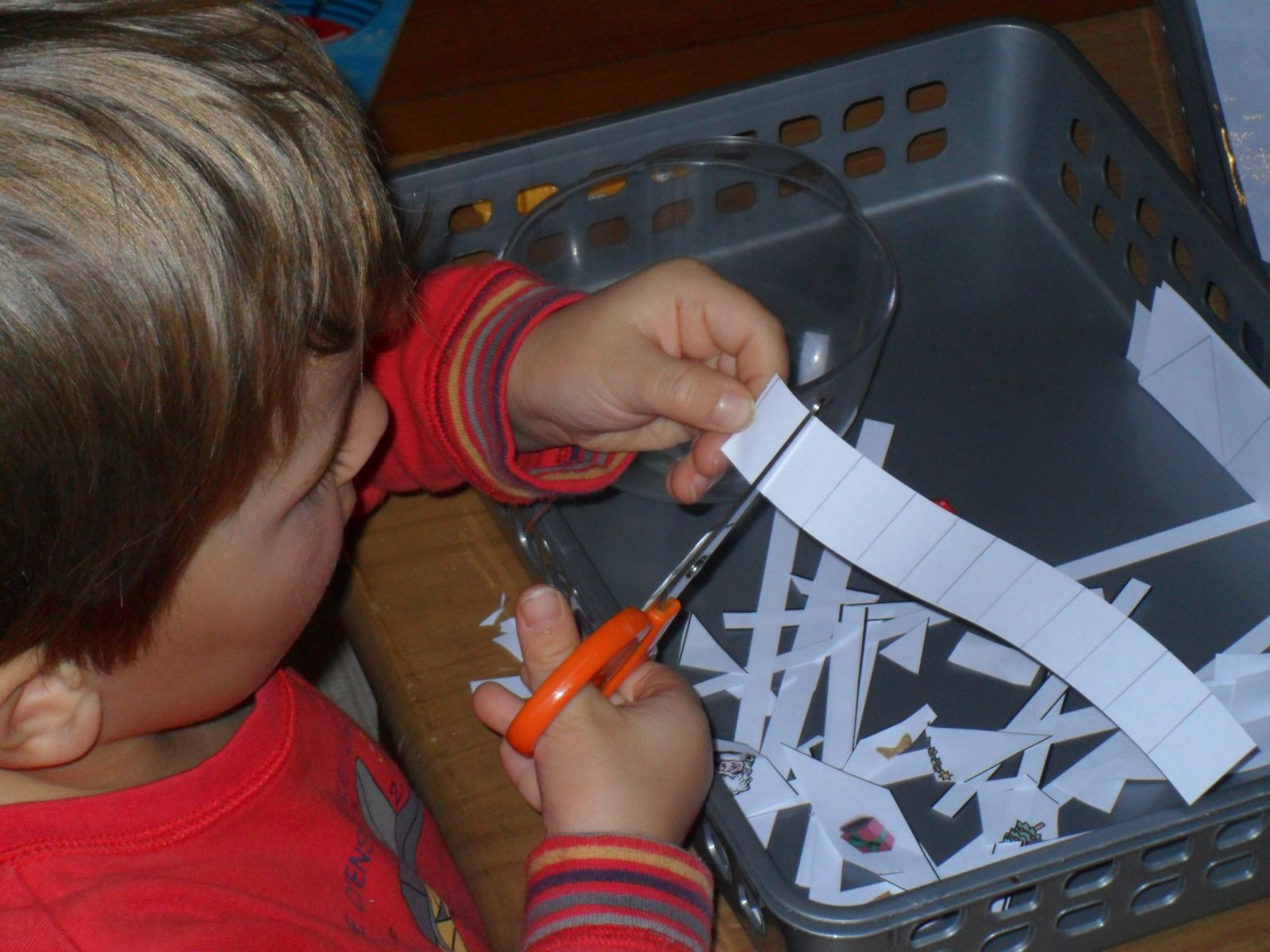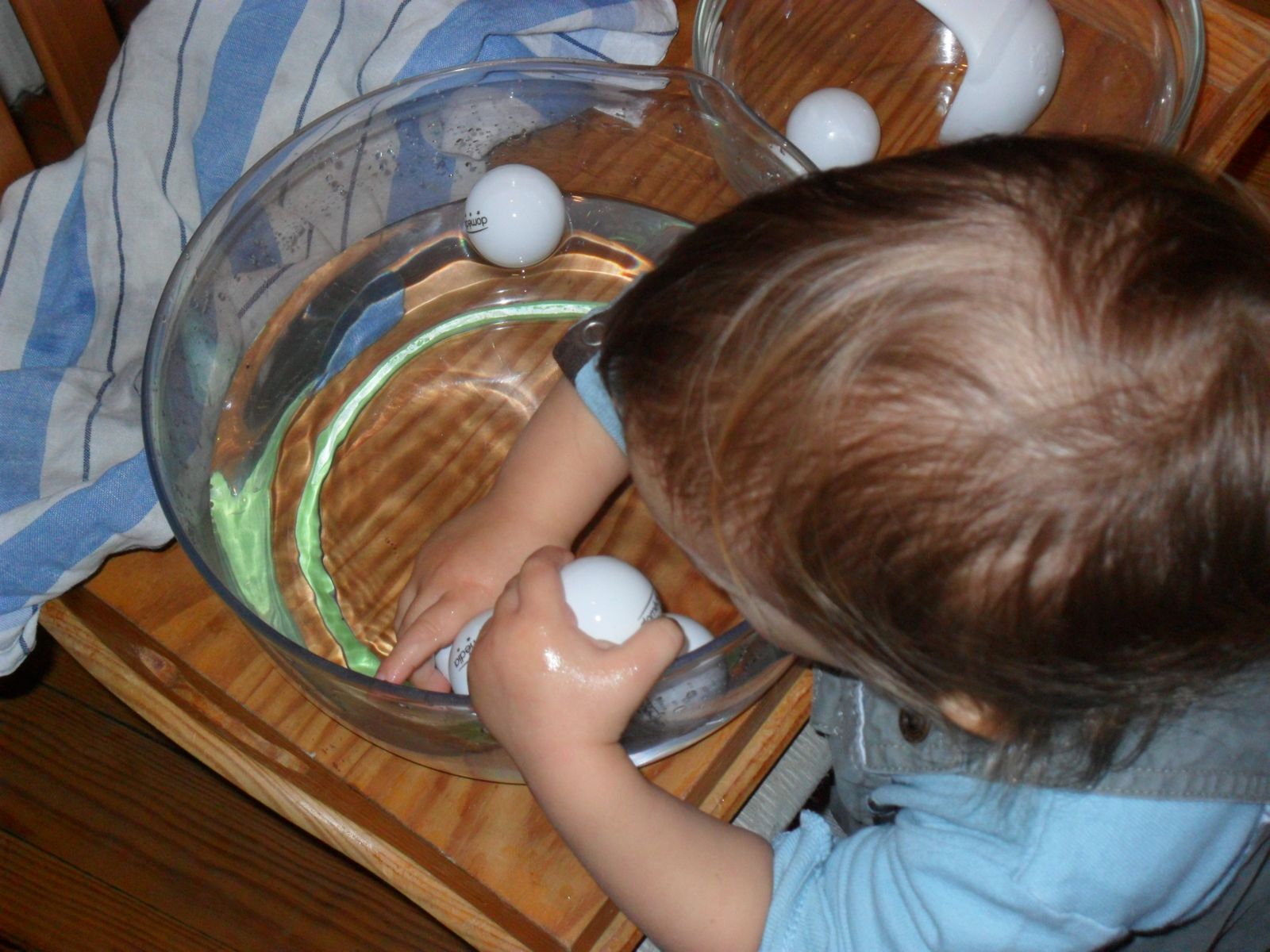 Voici une activité typiquement montessorienne: le transvasement. L'enfant doit transvaser les balles de ping-pong d'un récipient à un autre en se servant de la cuillère-passoire. Deux possibilités s'offrent à lui: transvaser avec la cuillère depuis le récipient rempli d'eau et à la main depuis le récipient vide, ou tout faire avec la cuillère. (Alana a utilisé la première solution, Jonah la seconde.) Préparer un torchon ou une éponge pour que l'enfant puisse essuyer ses mains ainsi que l'eau qui se serait répandue sur le plateau.