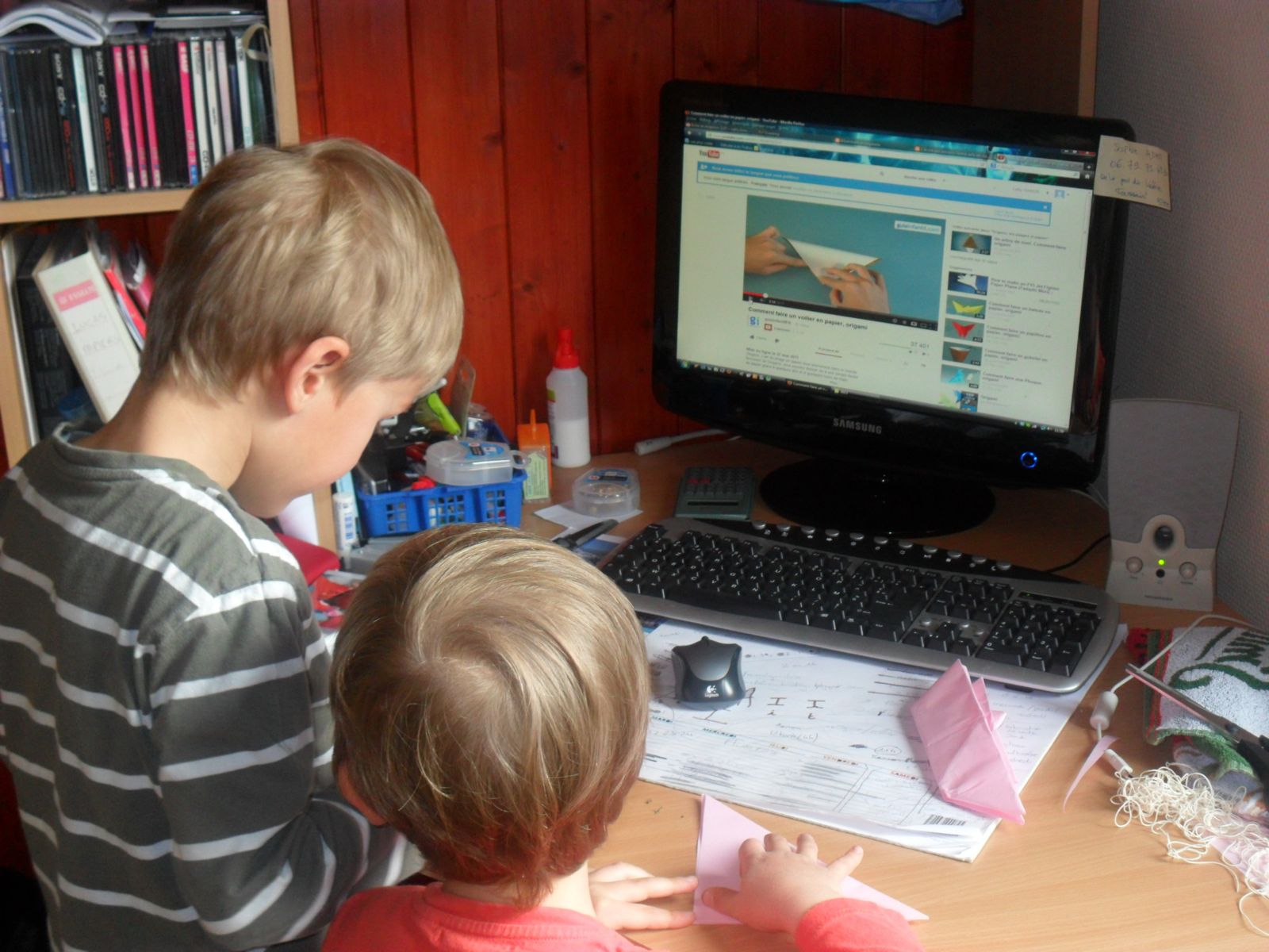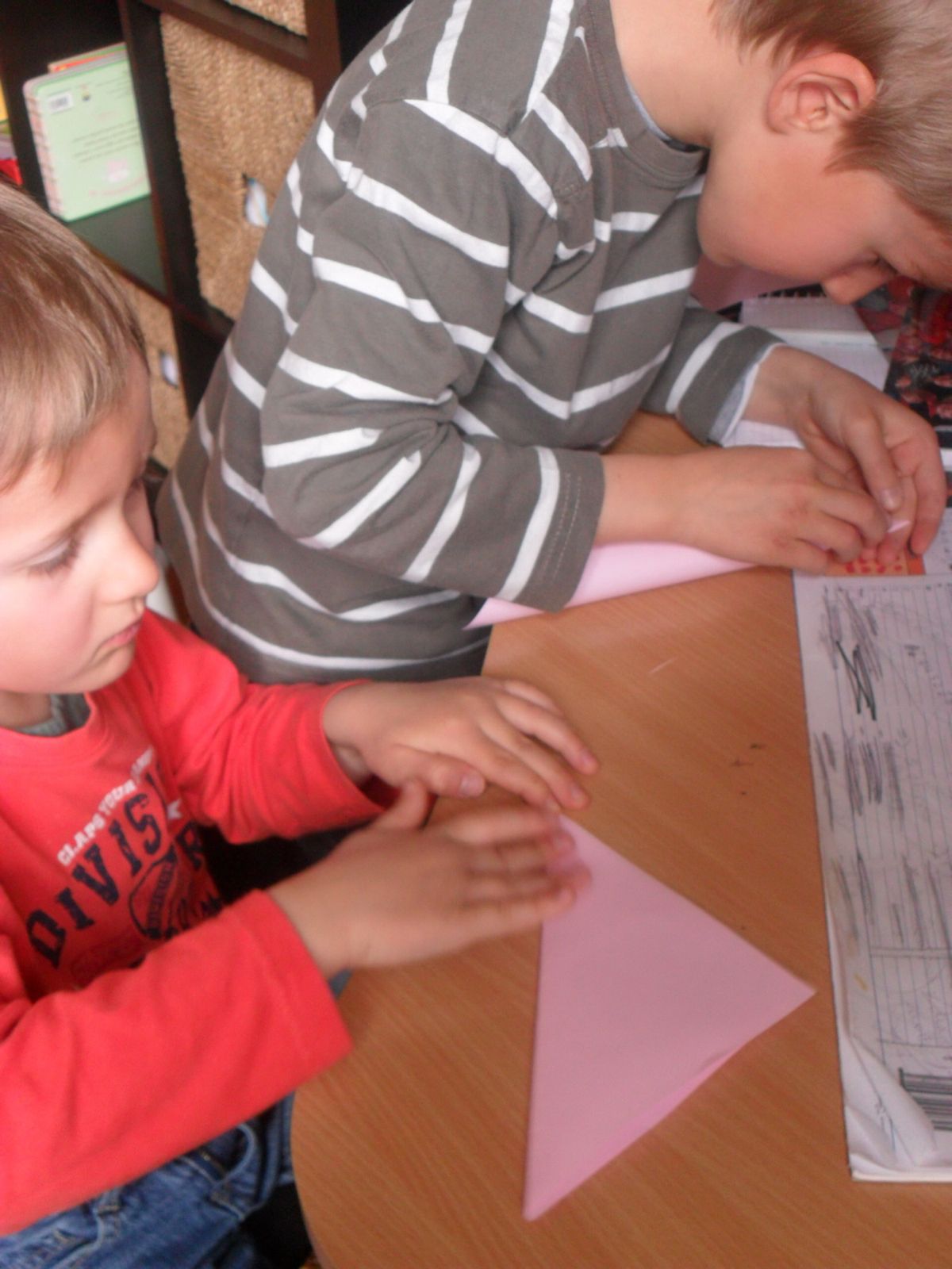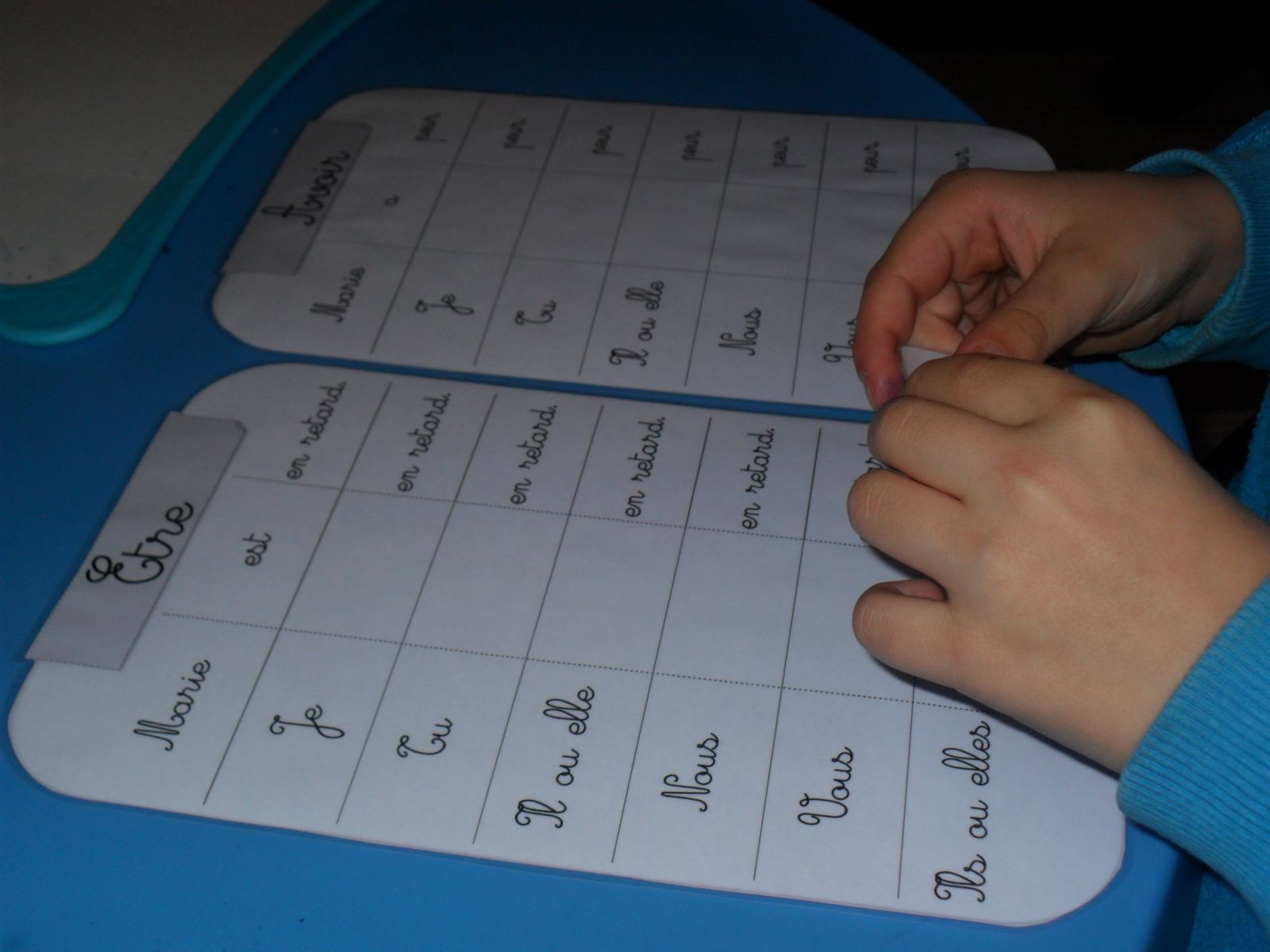 G. devait travailler les verbes au présent de l'indicatif, en particulier être, avoir et aller. Comme Alana était aussi dans la classe et s'amusait avec les formes à poinçonner, j'ai eu l'idée de proposer à G. des questions avec deux réponses possibles, pour lesquelles il devait répondre en poinçonnant la bonne réponse. Cette activité lui a plu, elle a ajouté un côté ludique à l'exercice.