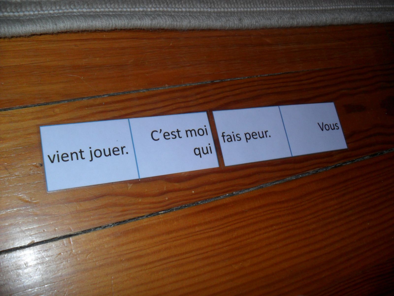 Il a ensuite travaillé sur les verbes être et avoir avec l'activité du site "boutdegomme": il s'agit de mettre les étiquettes des verbes conjugués au bon endroit. D'habitude, G. fait cette activité en prenant les verbes dans l'ordre (première personne, puis deuxième, etc). Cette fois-ci, je lui ai fait piocher les verbes au hasard.
