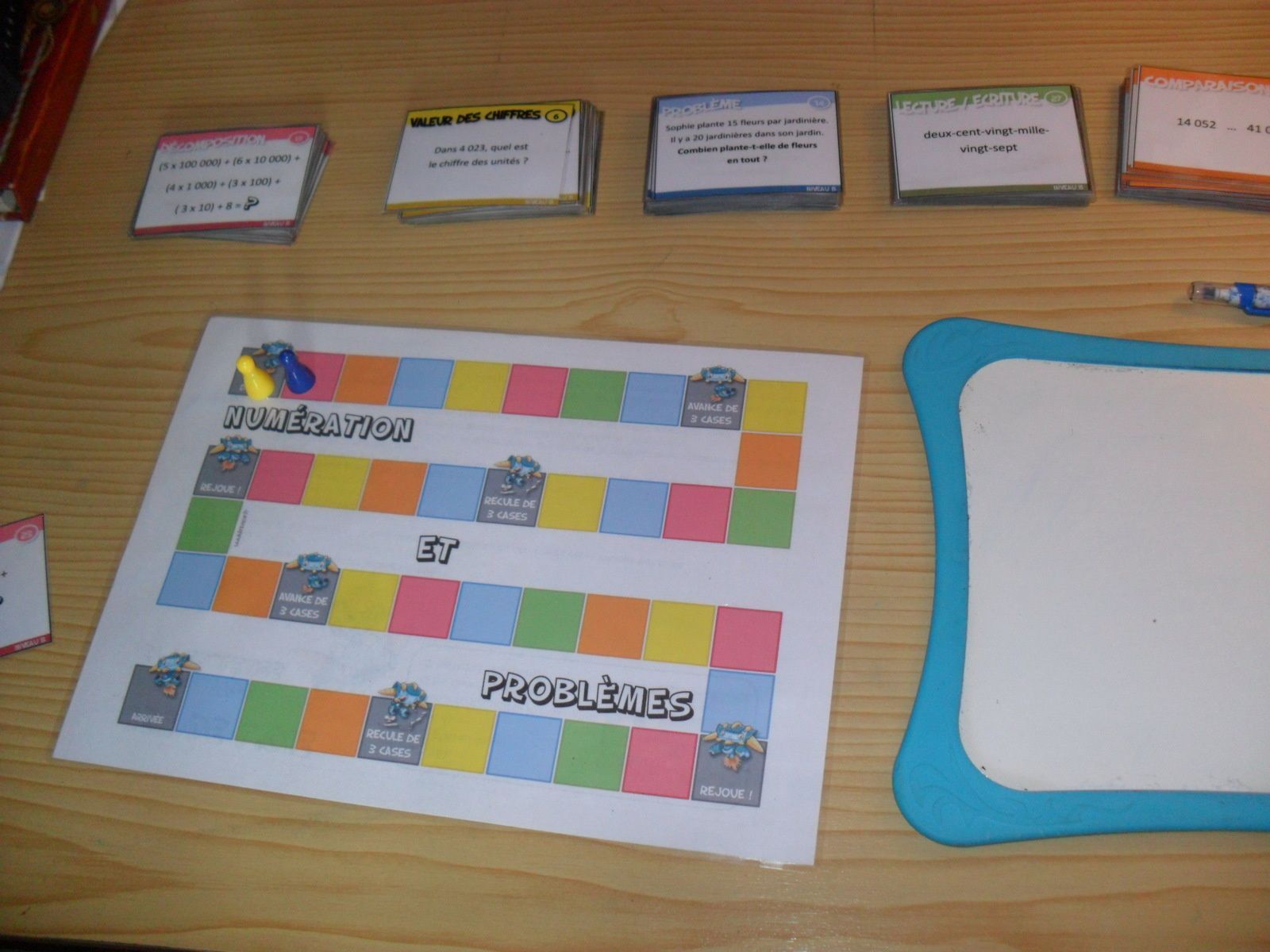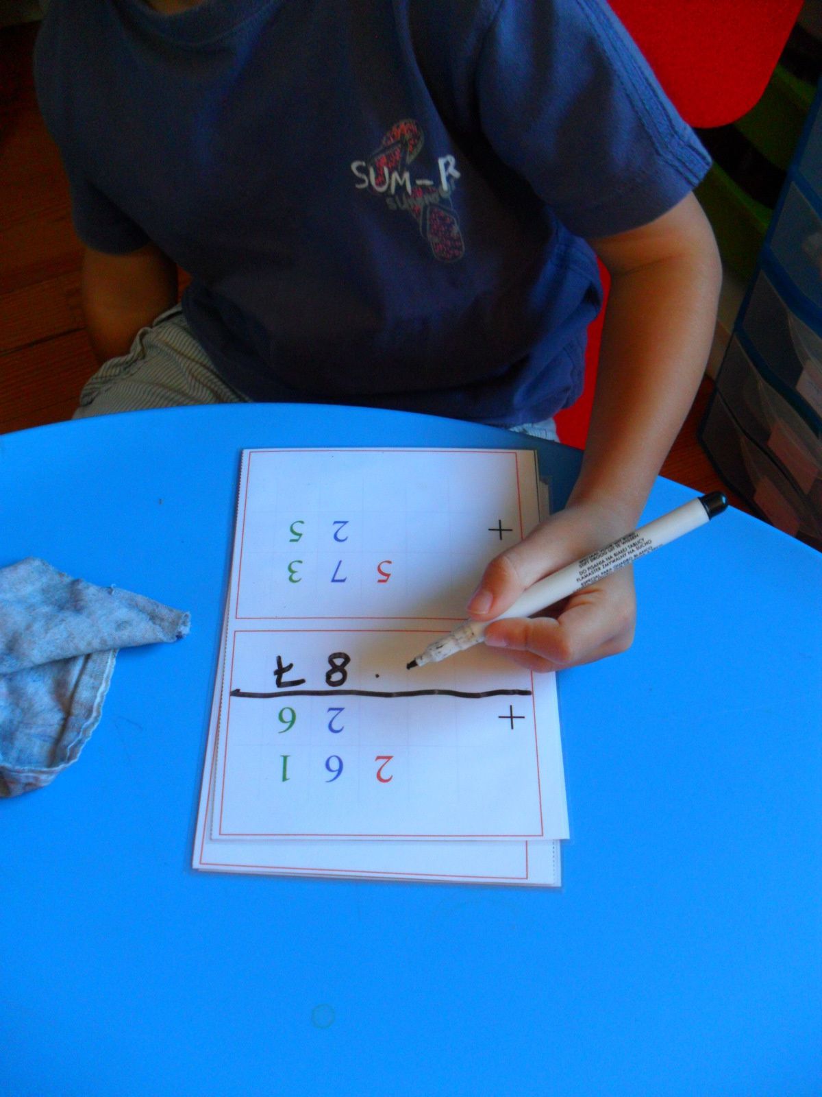 Pour continuer l'apprentissage des additions sans retenue, Jonah s'entraîne avec les cartes de boutique documents Montessori (il est autonome puisqu'il n'a qu'à retourner les cartes pour voir les corrections).