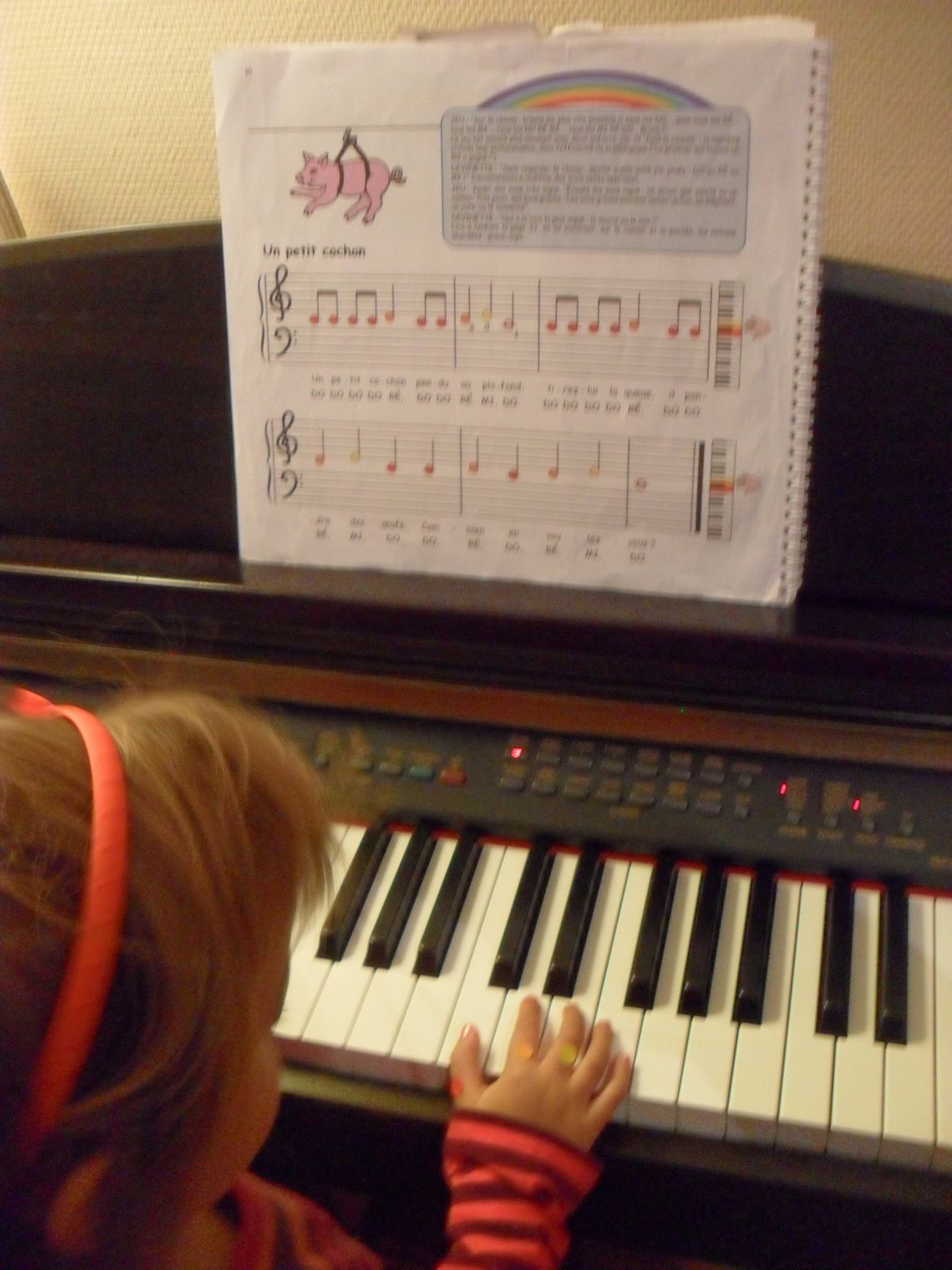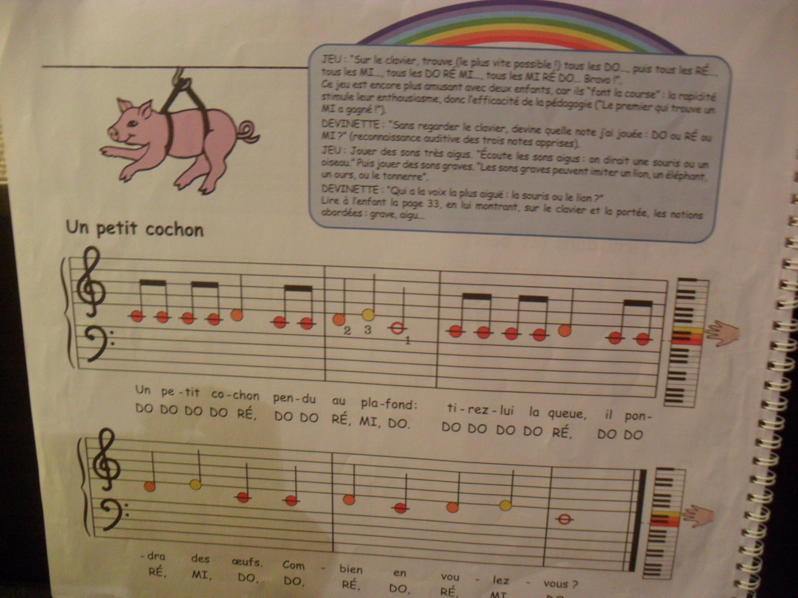 Pour l'apprentissage du piano auprès des jeunes enfants, j'utilise deux méthodes différentes : Le piano arc en ciel , méthode qui utilise un code couleurs et des gommettes pour l'apprentissage des notes et Ma toute petite méthode de piano, qui rend l'enfant acteur de son apprentissage puisqu'il peut dessiner et colorier sur sa méthode.