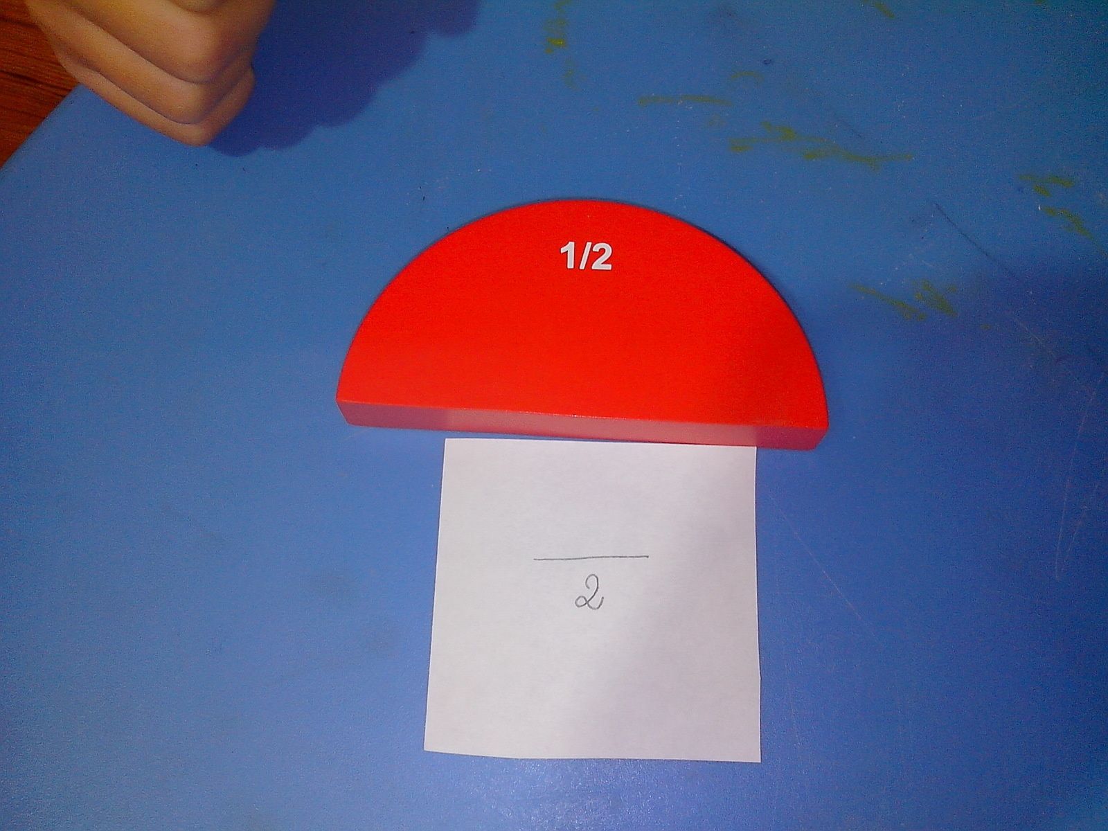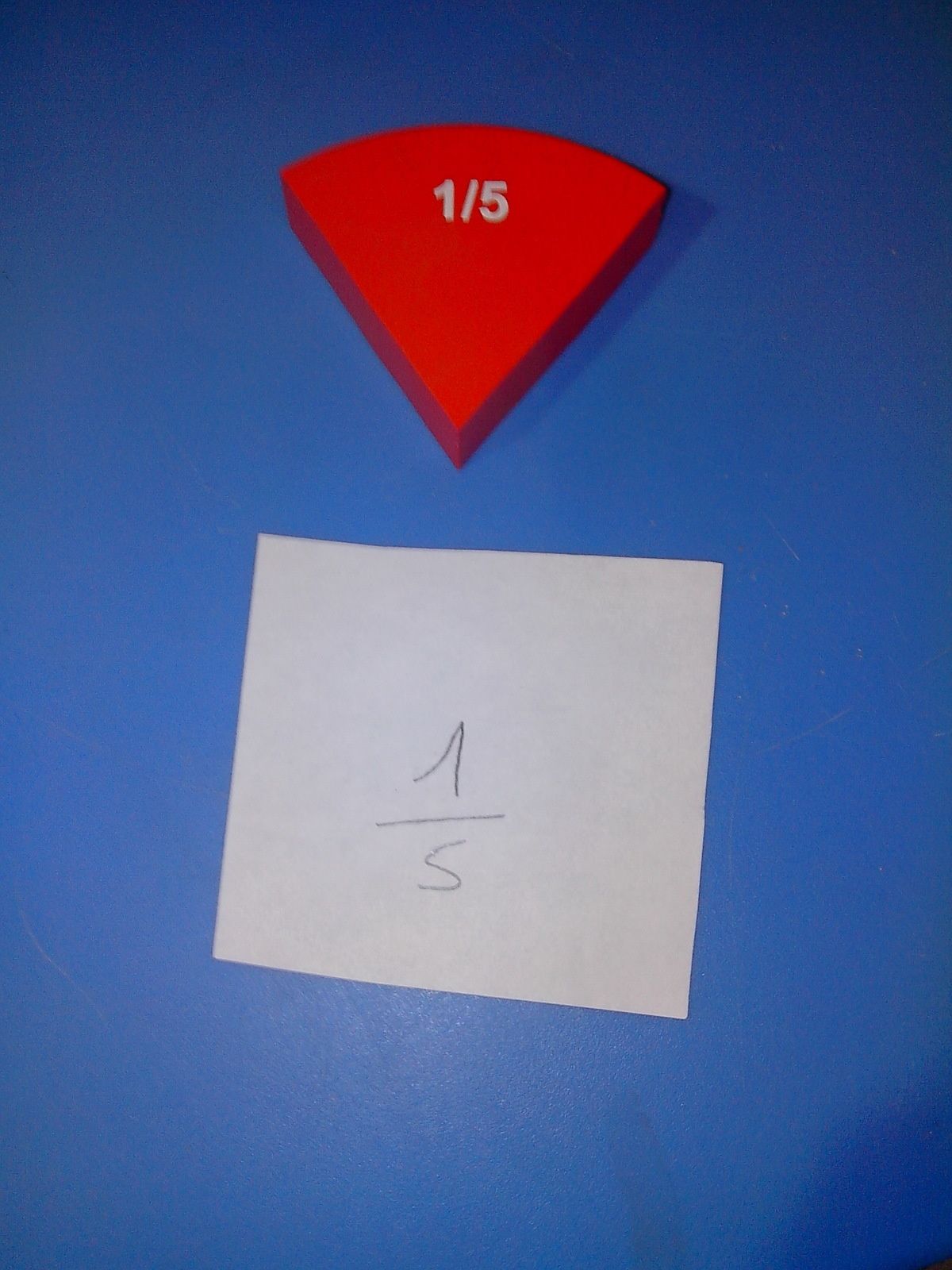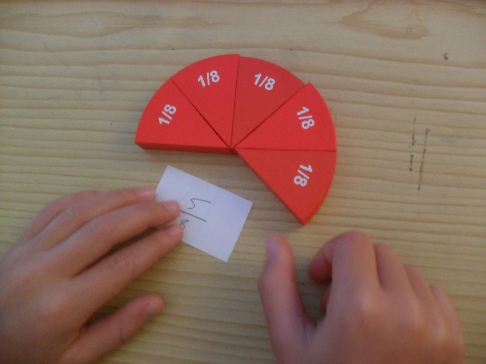 Je lui ai ensuite proposé le même jeu que lors de la première présentation. Je lui écrivais des fractions sur des bouts de papier, il devait les former avec le matériel.