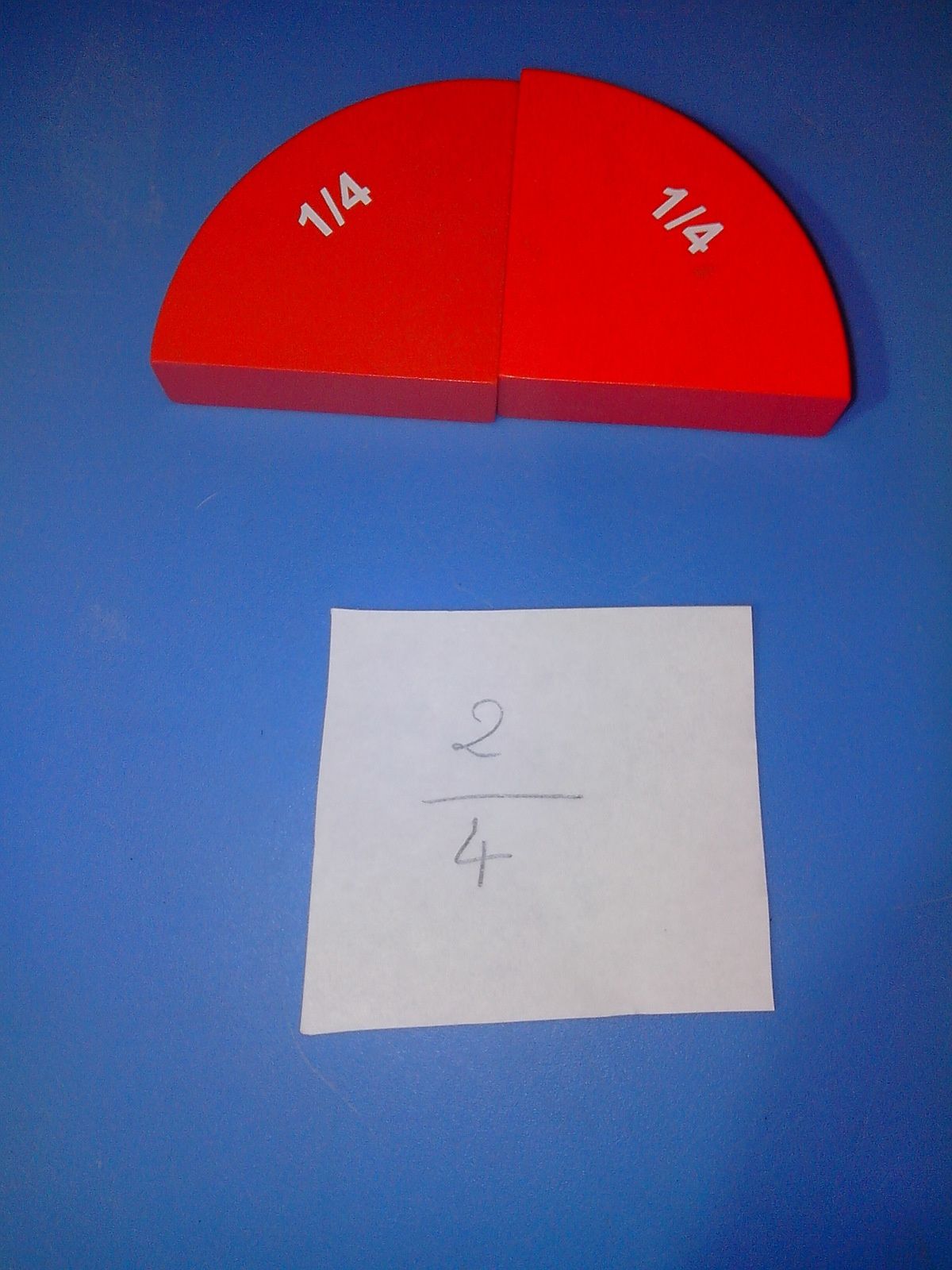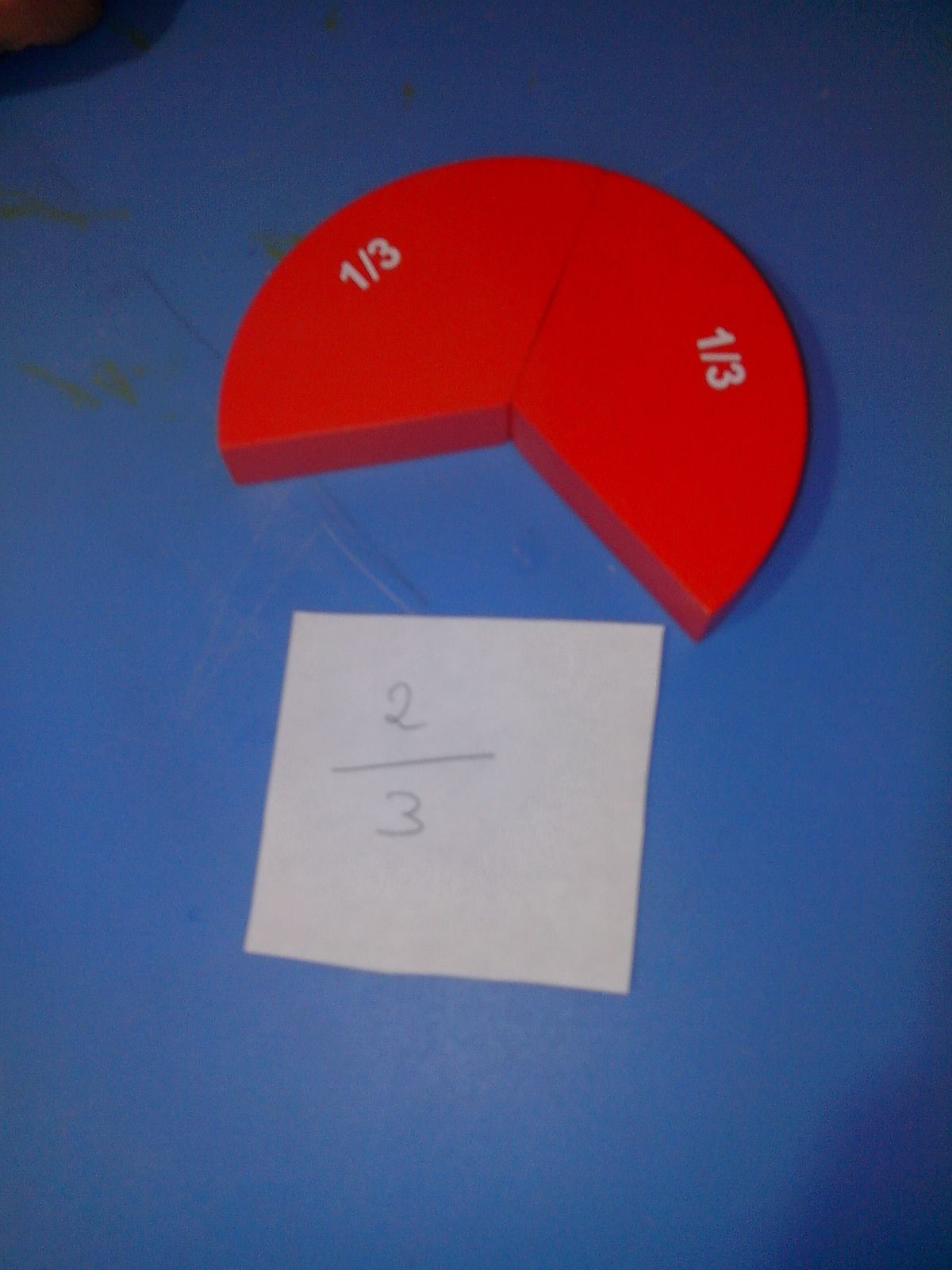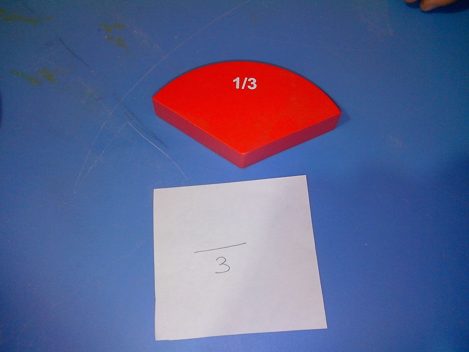 Je lui ai ensuite proposé le même jeu que lors de la première présentation. Je lui écrivais des fractions sur des bouts de papier, il devait les former avec le matériel.