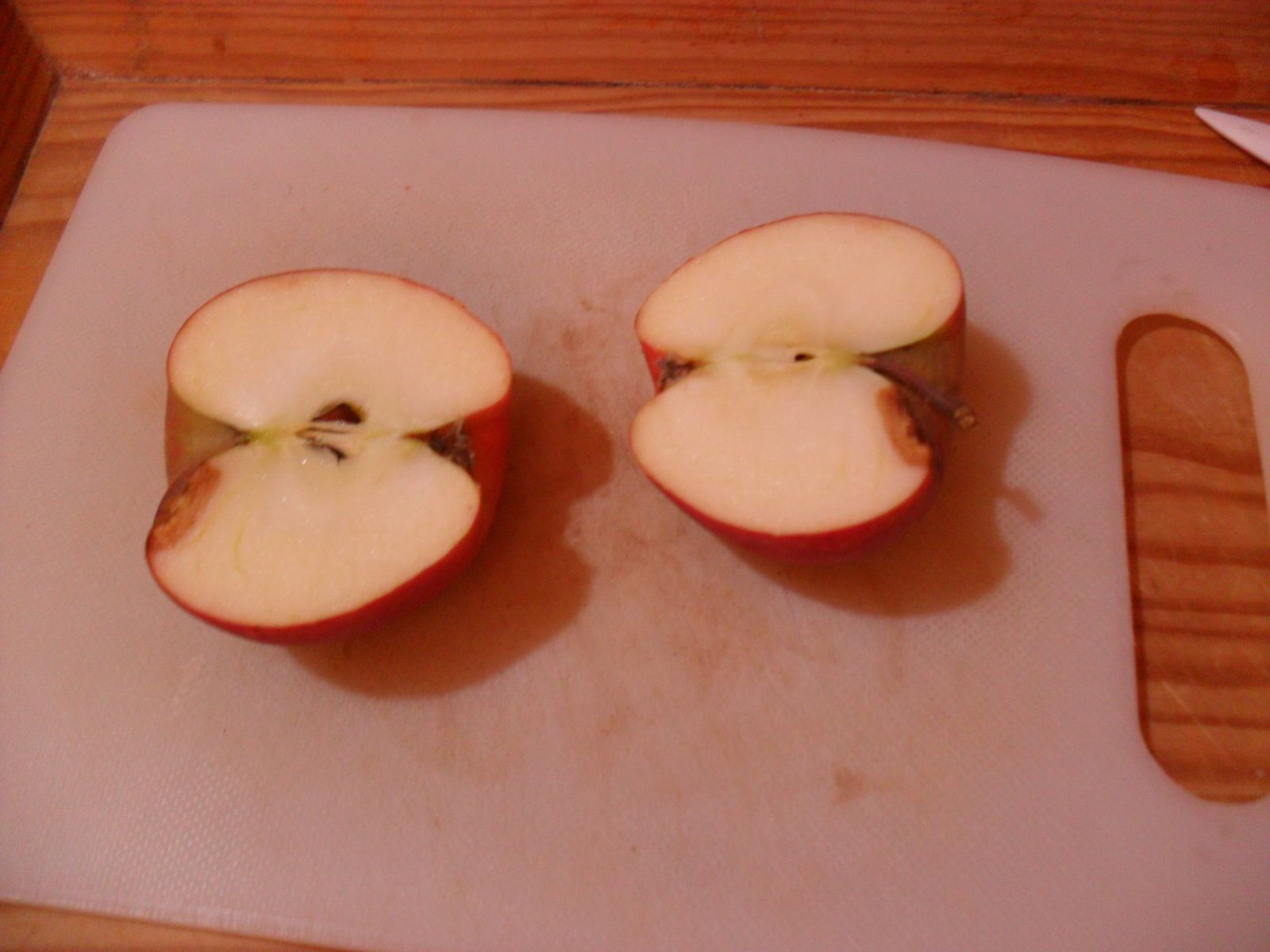 Puis j'ai coupé les deux moitiés encore en 2, pour obtenir des quarts de pomme.