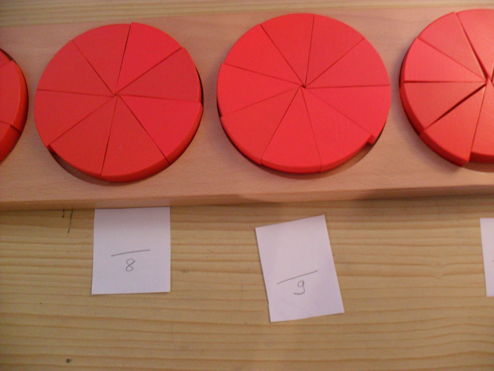 Un autre jour, j'ai fait une deuxième présentation des fractions à Lucas. Après avoir vérifié que les fractions jusqu'aux cinquièmes étaient bien comprises et que les notions de numérateur et de dénominateur étaient acquises, je lui ai fait une leçon en trois temps sur les familles des sixièmes, septièmes, huitièmes, neuvièmes et dixièmes.
