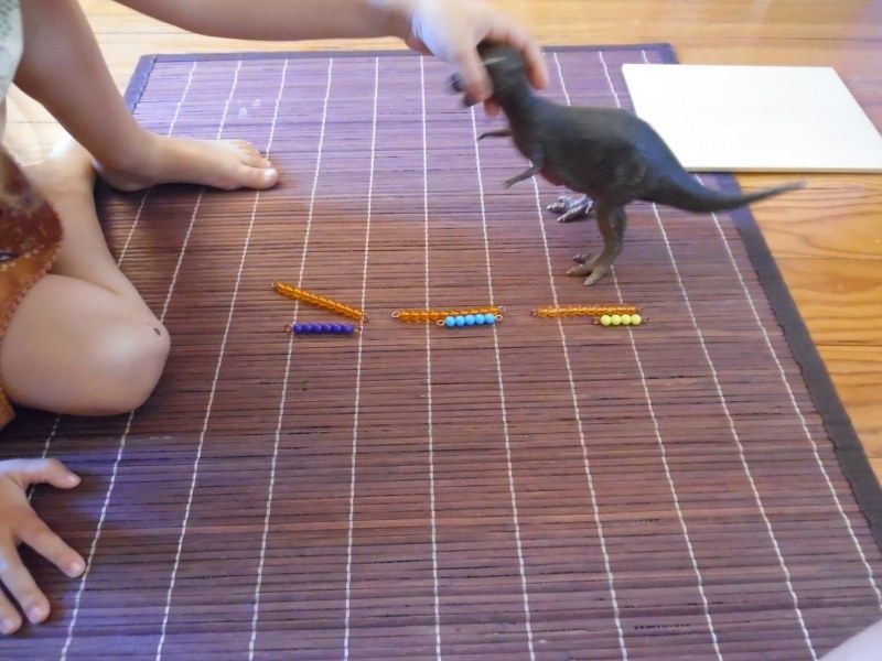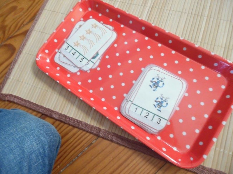 Si les enfants comprennent vite le fonctionnement des nombres, ils ont souvent besoin d'un peu d'entraînement pour mémoriser le vocabulaire. Je lui ai donc proposé une activité d'association des cartes et des perles Montessori (cartes de Boutique documents Montessori) :