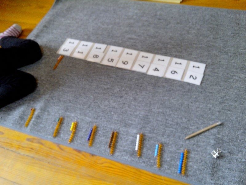 Pour apprendre les nombres de 10 à 19 à Alana, je lui ai d'abord présenté les nombres avec les perles Montessori, sous forme de leçon en 3 temps :