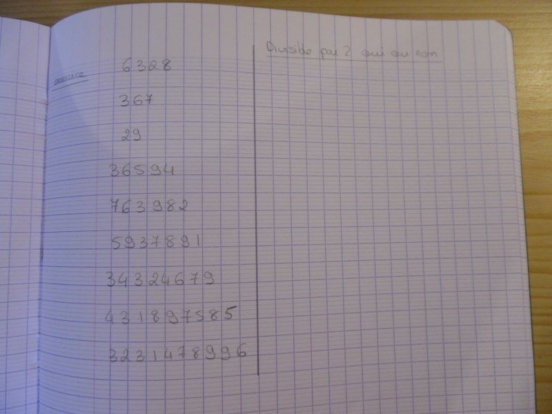 Avec Lucas, nous travaillons depuis un moment sur les nombres divisibles par 2, 3, 4, 5, 7, 9, 10,11.