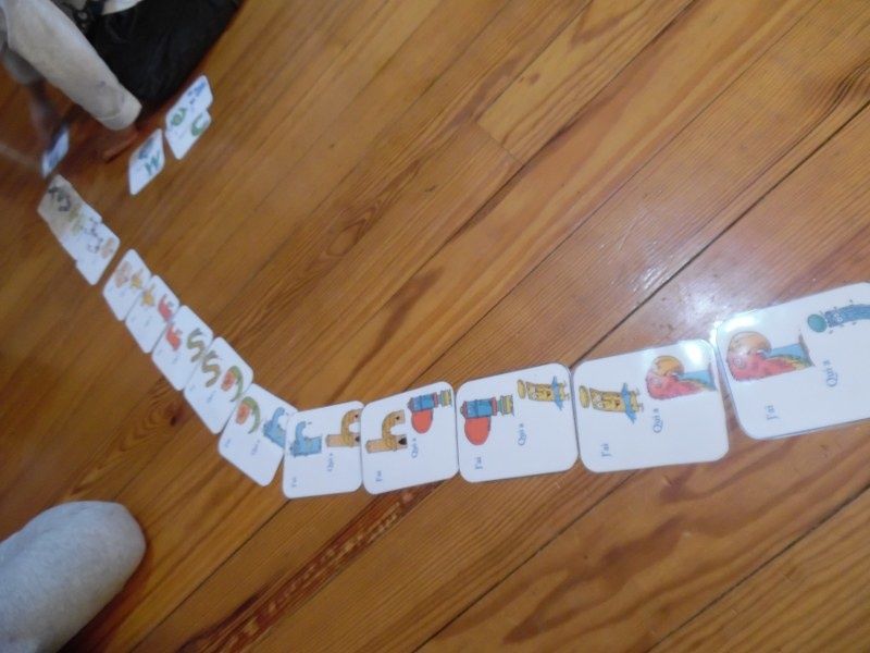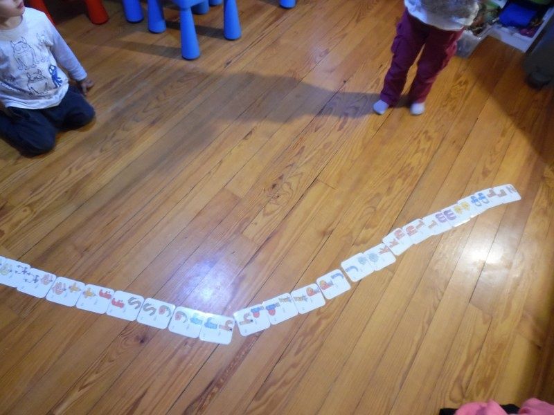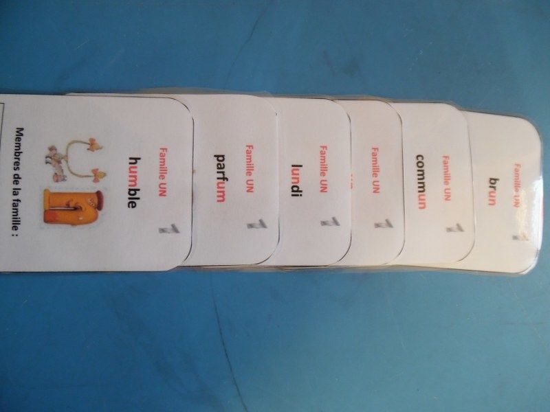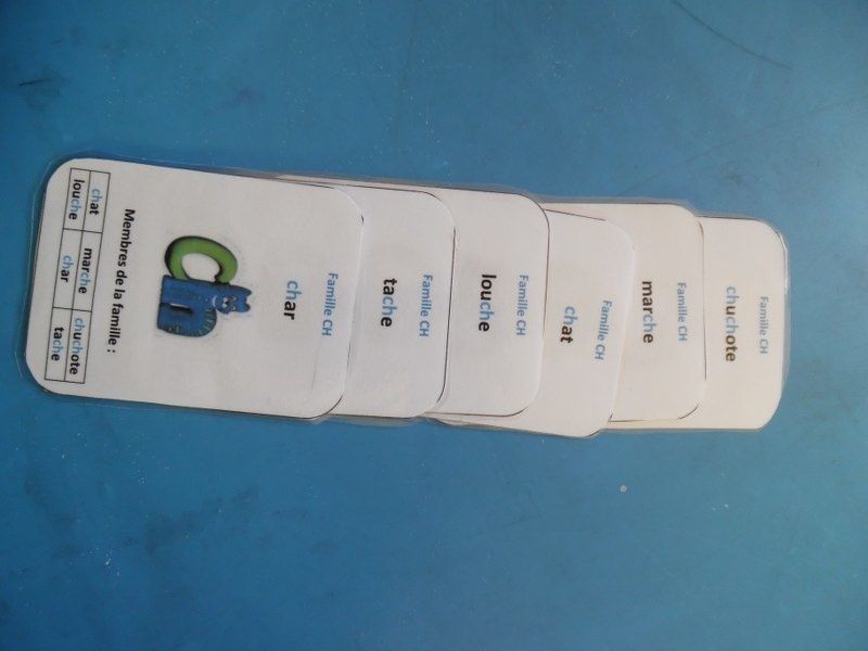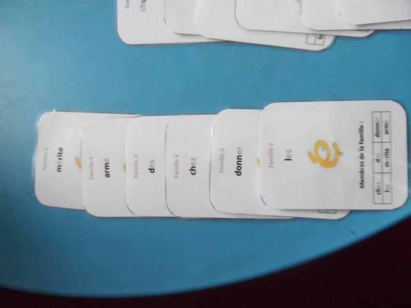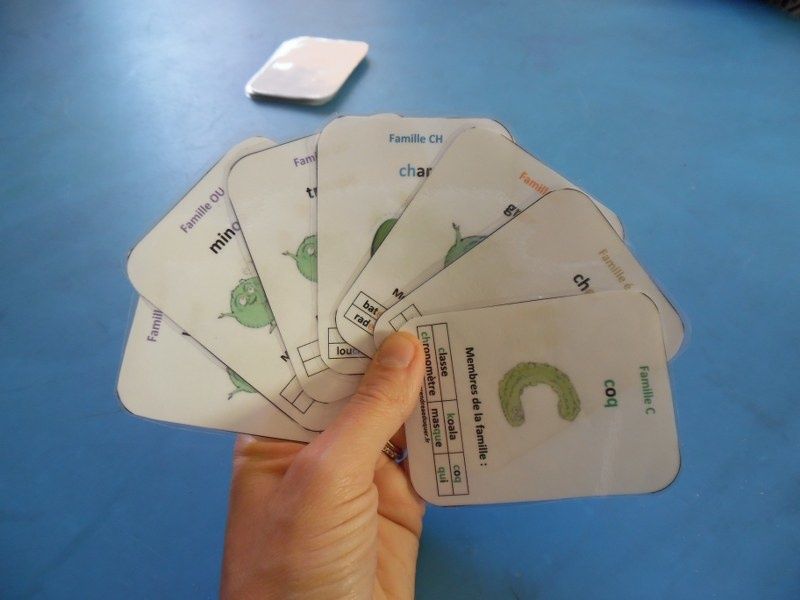 Nous avons joué ensuite à un jeu de 7 familles sur les Alphas, pour travailler sur les différentes graphies du son o, é, k, ch, on, un, ou.
