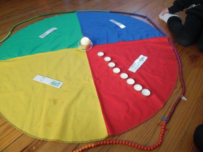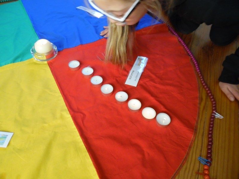 Je leur ai expliqué le rôle du tapis, de la chaîne de perles, de la bougie qui représente le soleil. Puis Kylie a tourné autour du soleil avec le globe dans les mains. Après chaque tour, j'allumais une bougie, jusqu'à ses 8 ans.