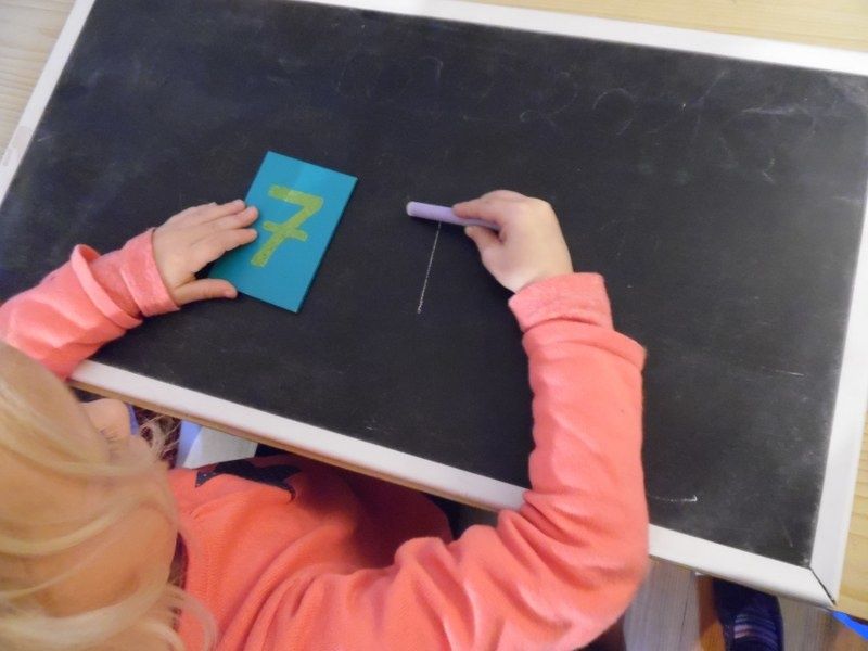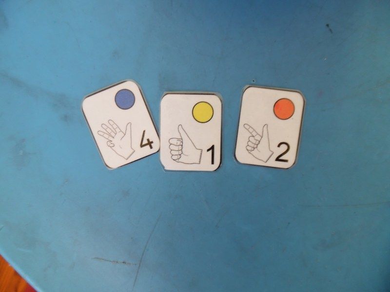 Puis, quand tous les jetons ont été posés, j'ai proposé l'activité inverse : j'enlèvais un jeton et je demandais quel nombre était découvert. Ca permet aux enfants de nommer eux-mêmes les nombres.