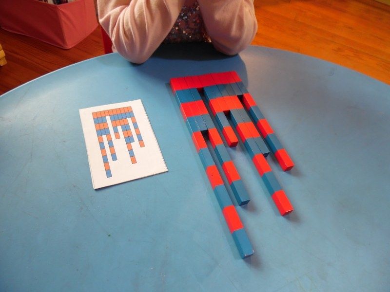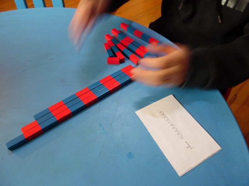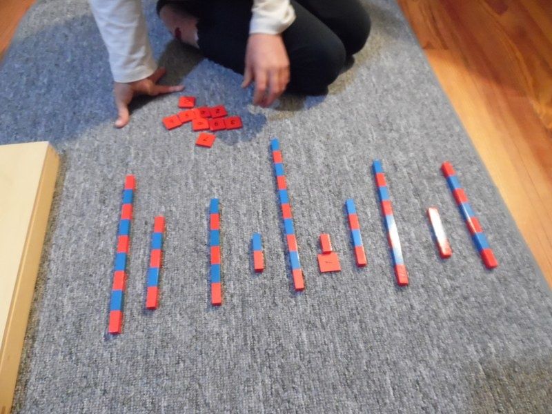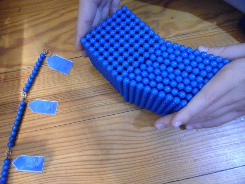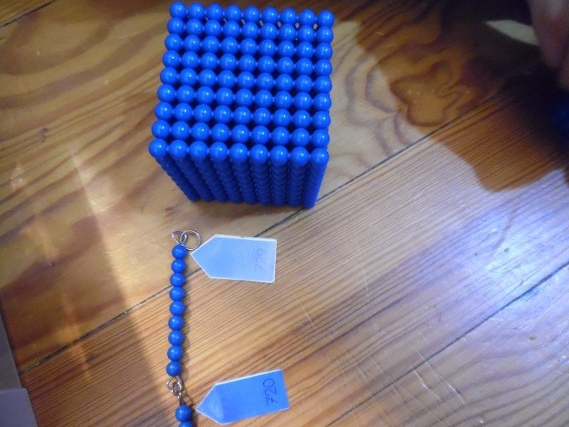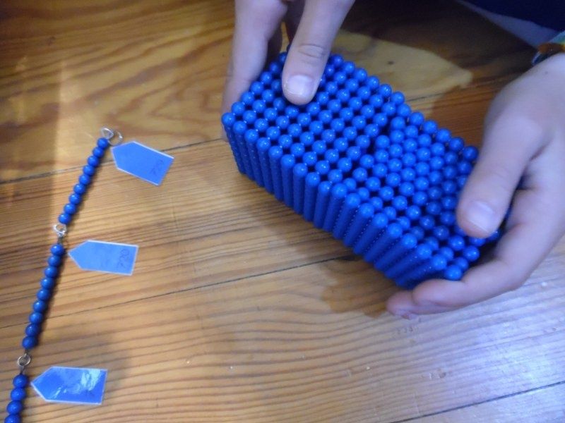 Après avoir travaillé avec les petites chaînes de perles et les carrés des nombres, Lucas a vu les nombres au cube avec les grandes chaînes de perles Montessori.