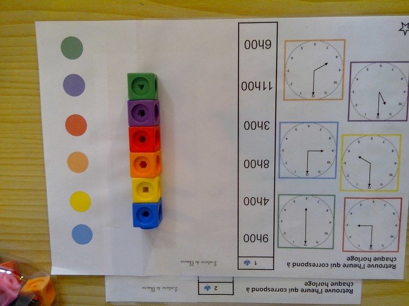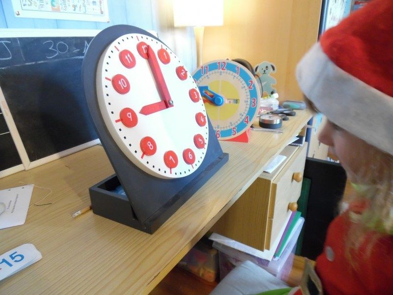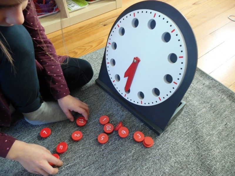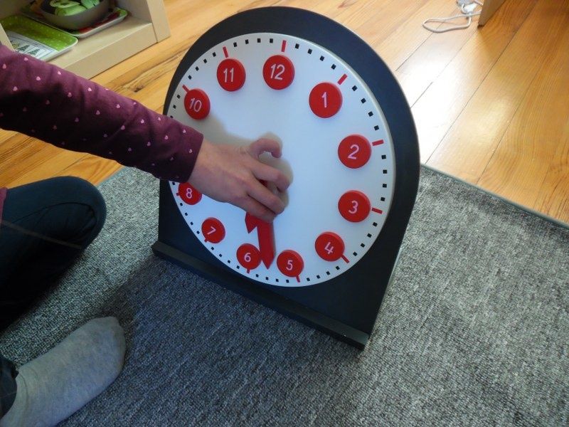 Alana a demandé à apprendre à lire l'heure. Pour l'instant, elle ne connaît que les nombres jusqu'à 20, j'ai donc décidé de ne lui apprendre que les heures piles, et d'attendre qu'elle ait progressé en numération pour aller plus loin dans l'apprentissage de l'heure.