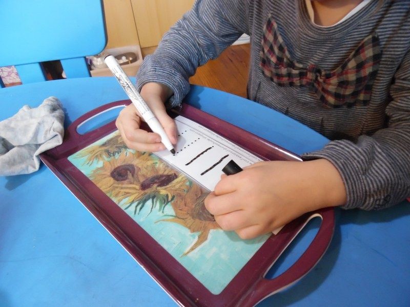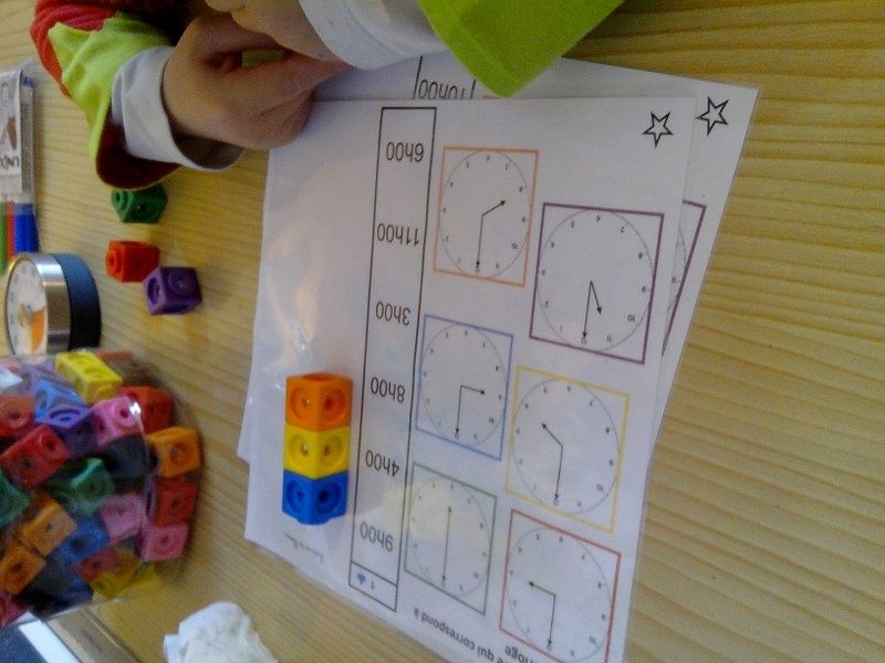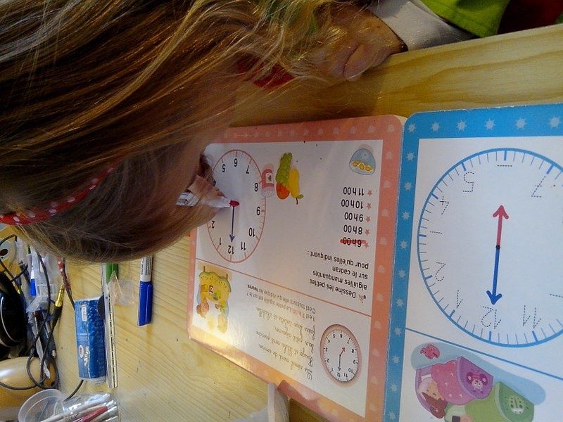 Les premiers exercices du livre-ardoise sur l'apprentissage de l'heure.
