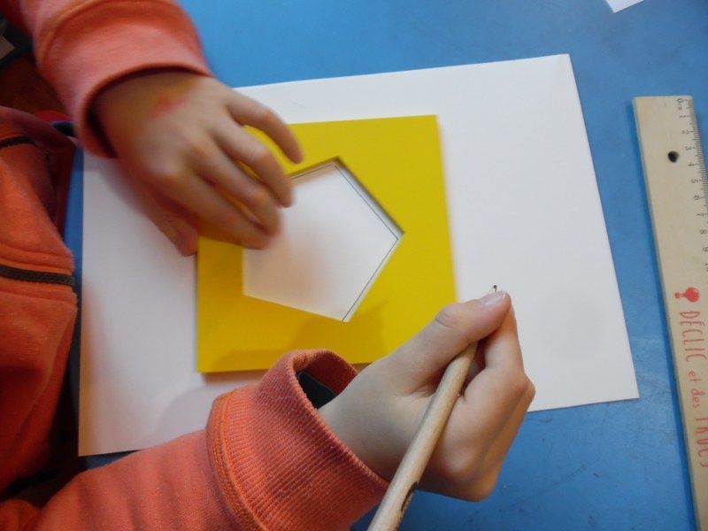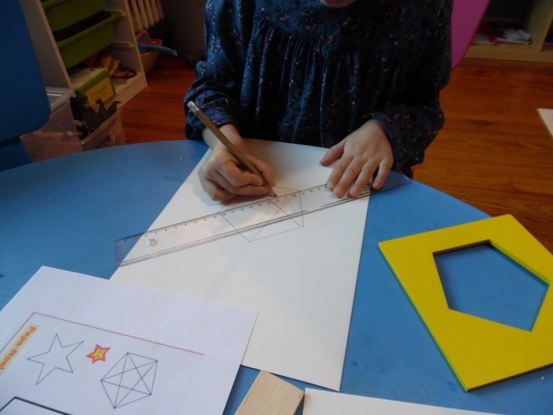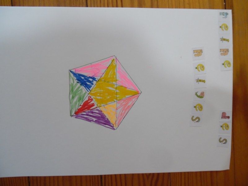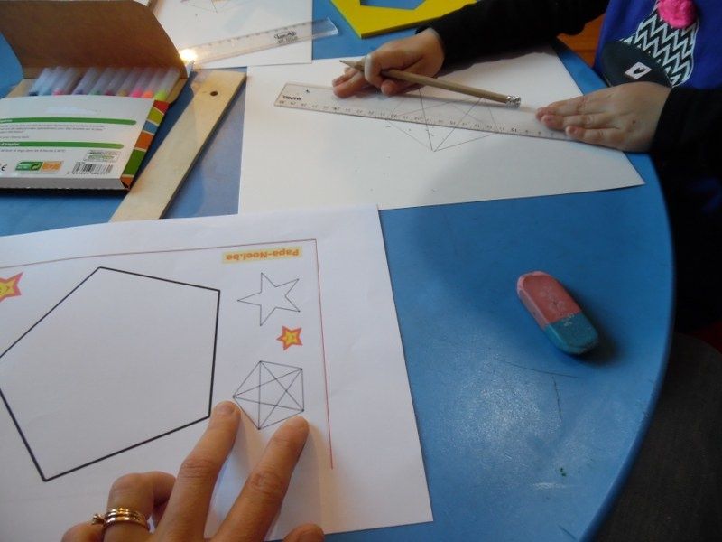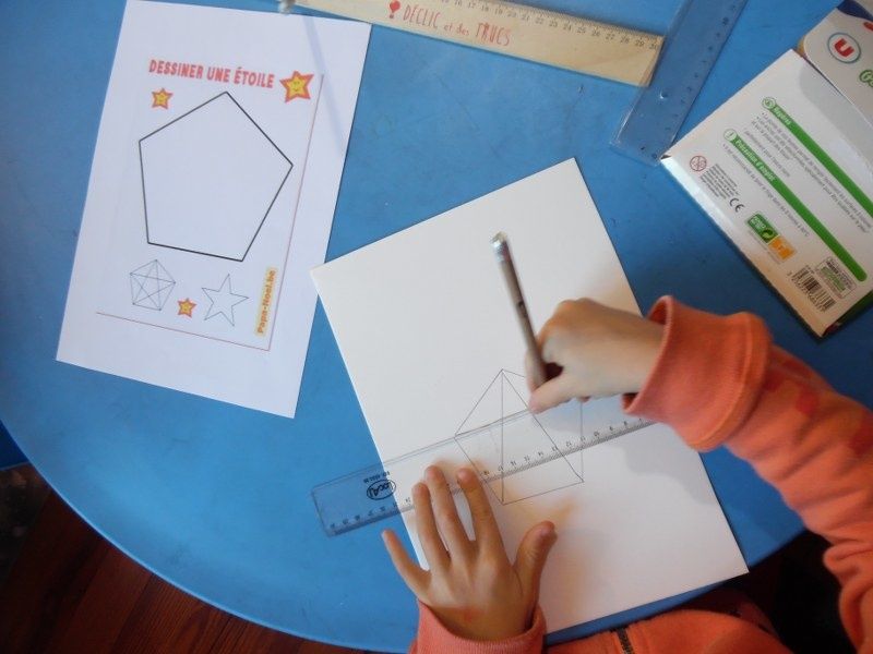 Tracer le pentagone grâce au cabinet de géométrie, relier certains sommets en utilisant la règle et colorier son étoile avant de la légender selon ses envies ! (avec un peu d'aide pour cette activité : je les ai guidés dans les tracés des segments).