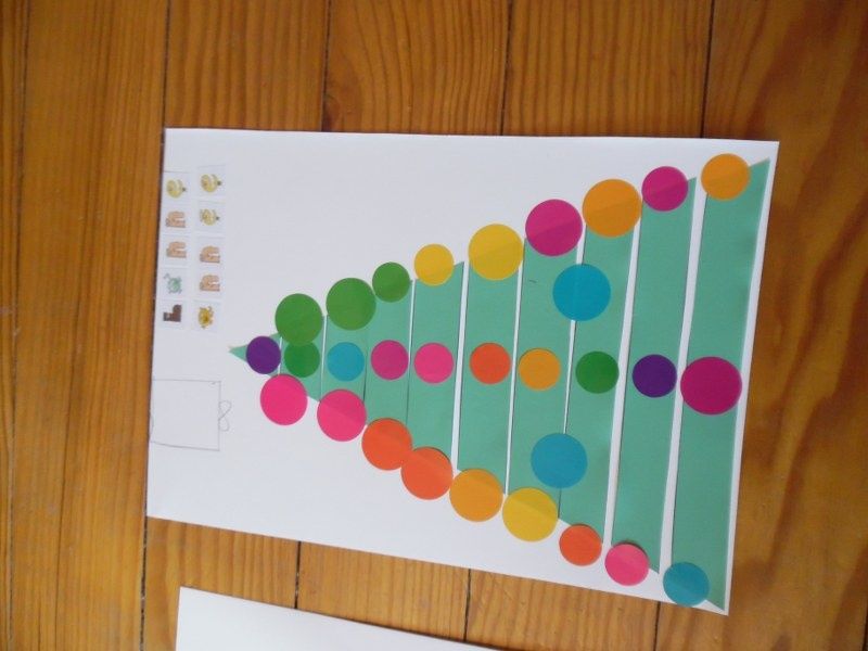 Coller des bandelettes de papier de 10 à 1, pour fabriquer un sapin, écrire "Bonne année" avec les Alphas, et décorer sa carte de jolis dessins et de boules de Noël.