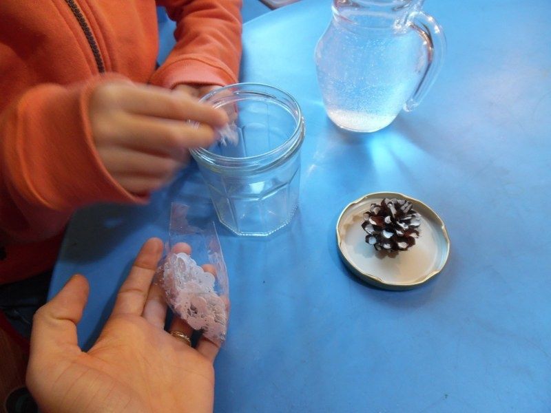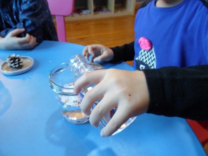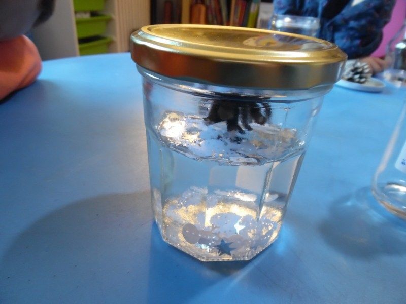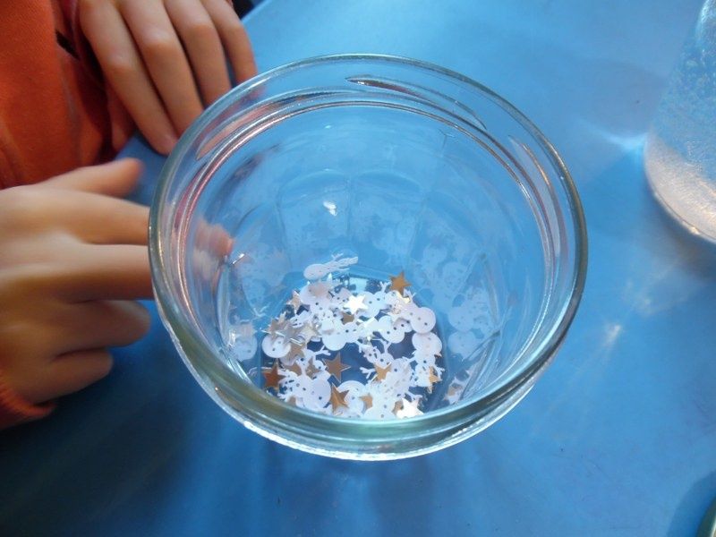 Une fois la peinture sèche, ils ont mis des paillettes dans leur bocal.