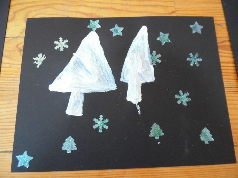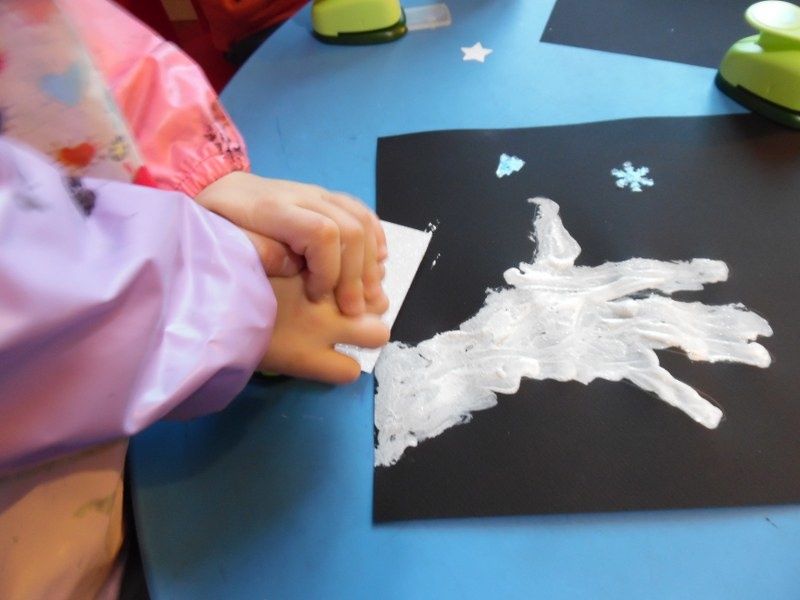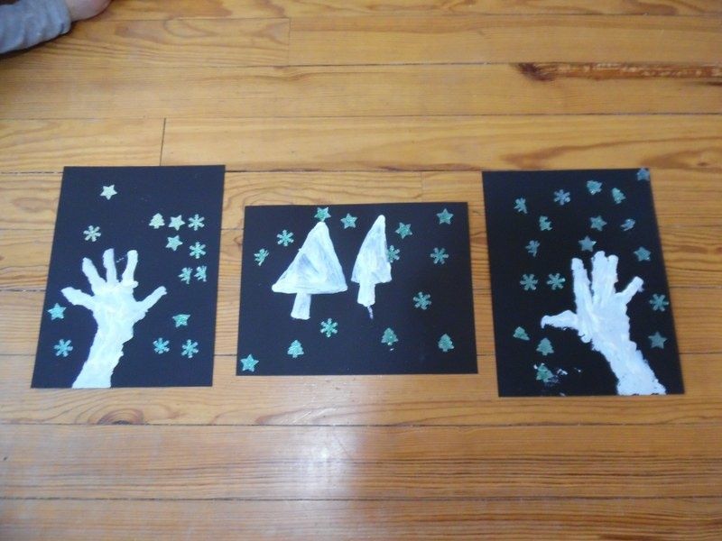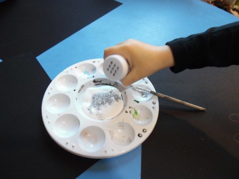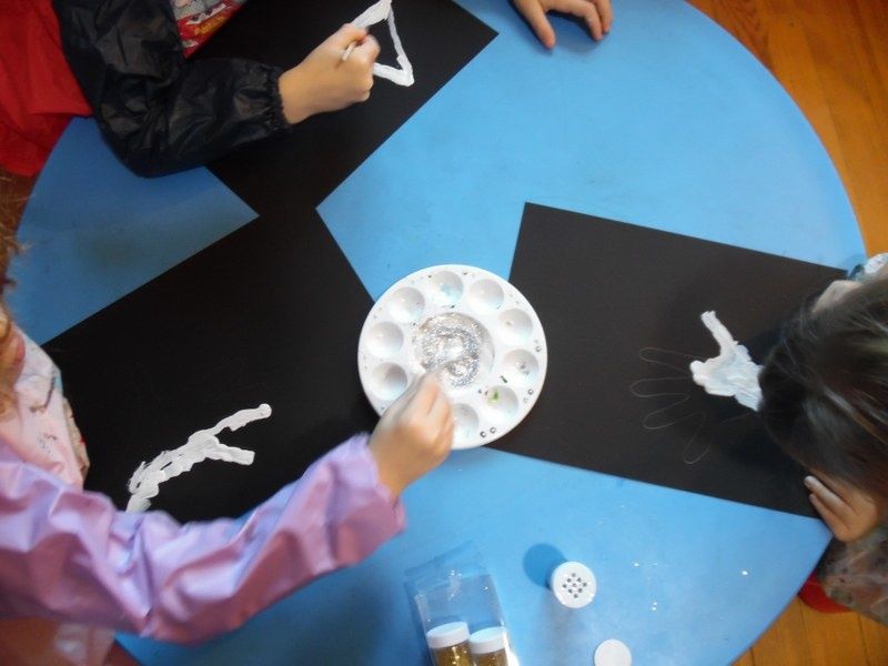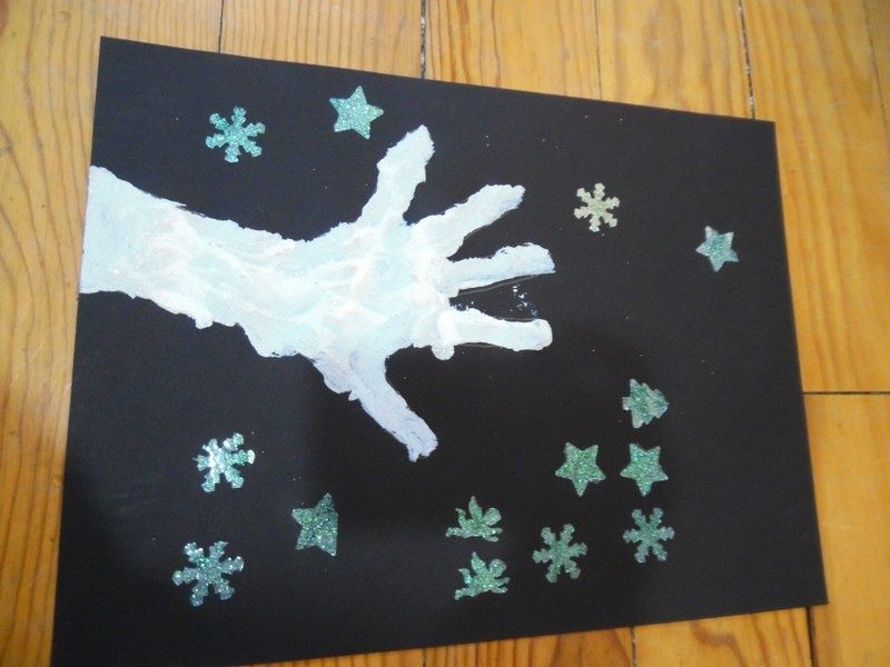 Après avoir tracé leur main sur une feuille noire, ils ont mis des paillettes dans de la peinture blanche.