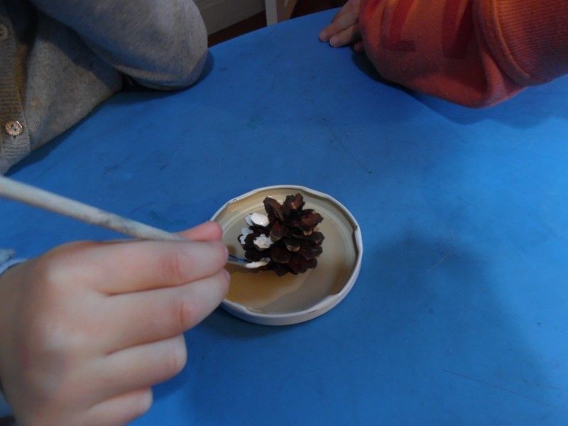 Ils ont peint une pomme de pin avec de la peinture blanche.