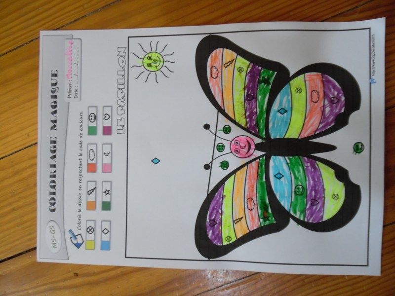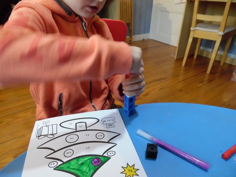 Coloriage magique : petites additions et petites soustractions en totale autonomie grâce aux petits cubes à emboîter. (Marceline a demandé à colorier un papillon).