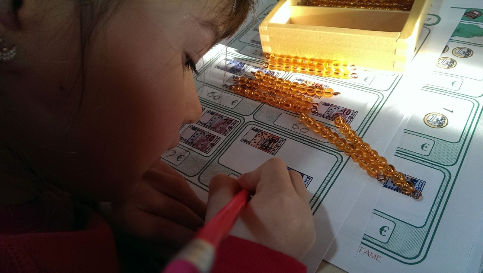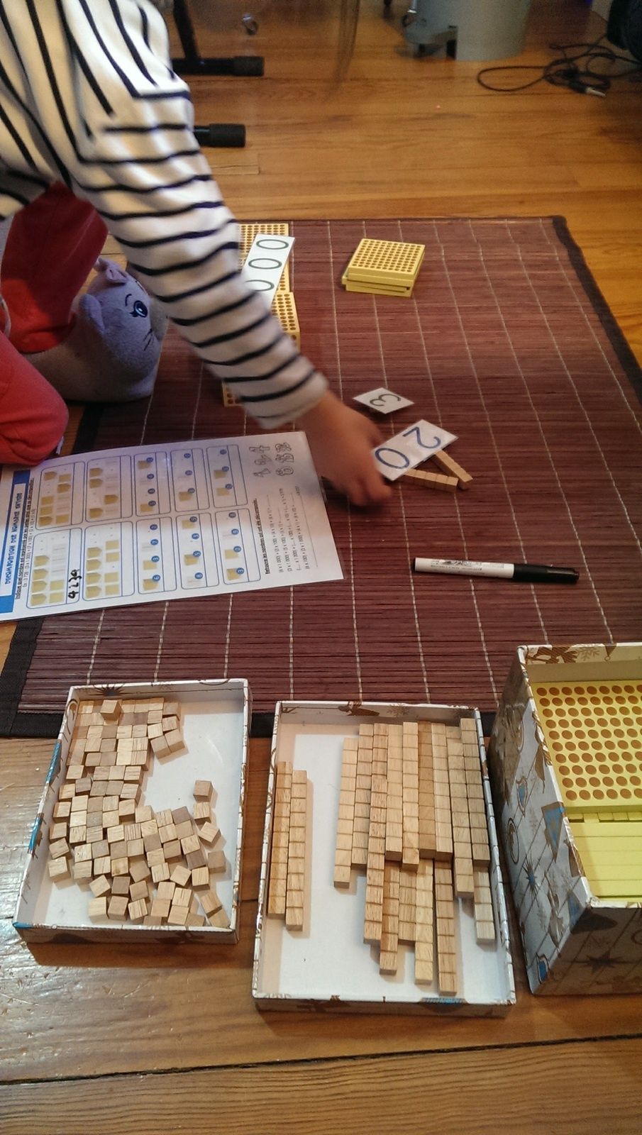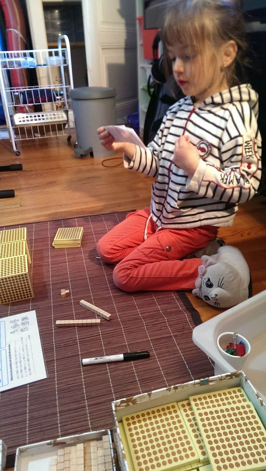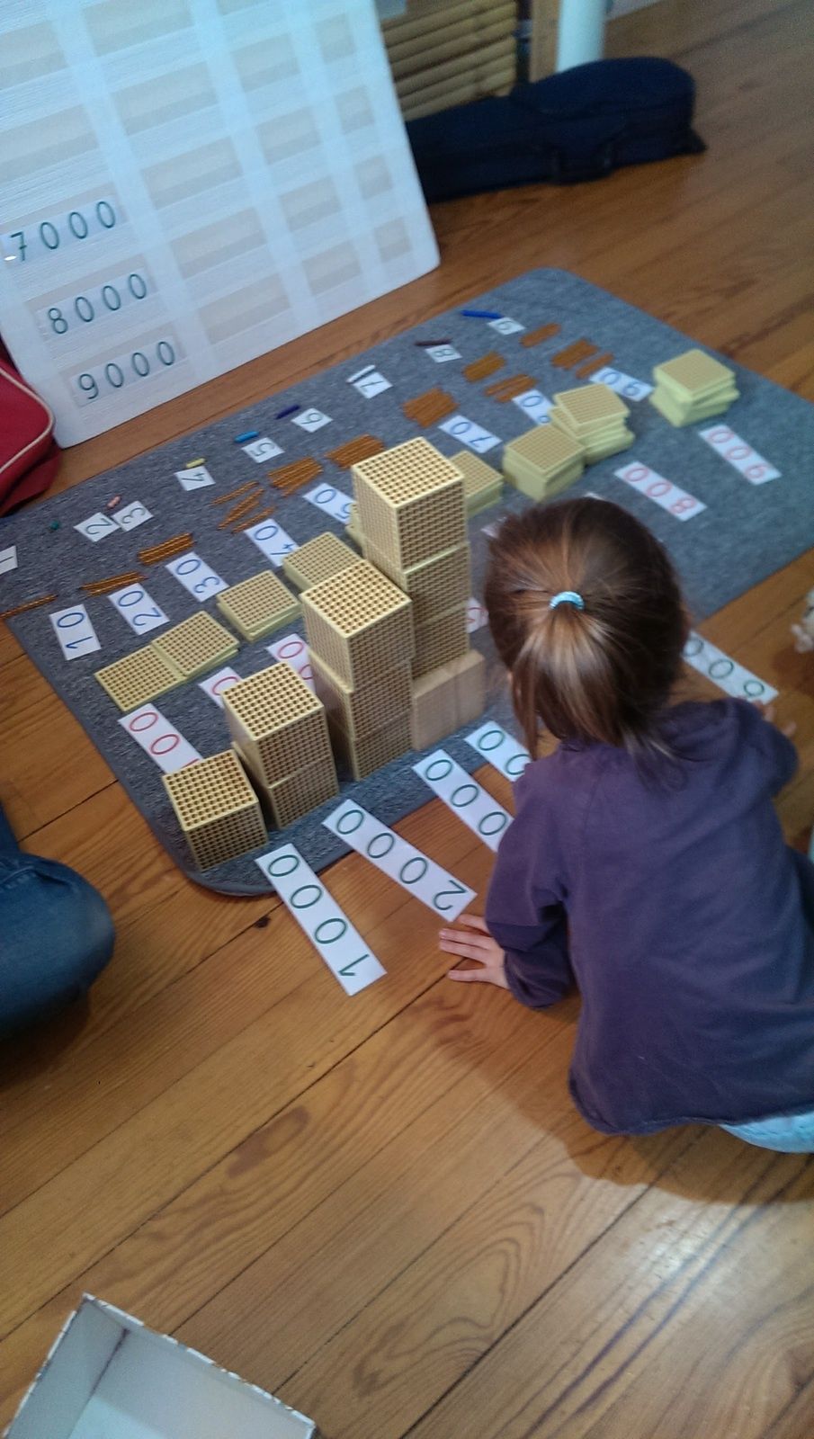 De la numération avec le matériel Lubienska pour réviser les nombres jusqu'à 9999 et travailler sur la notion d'unités, dizaines, centaines, milliers qui lui pose encore un peu problème.