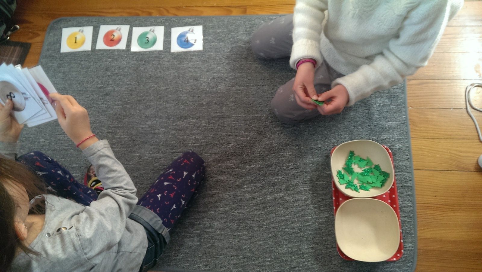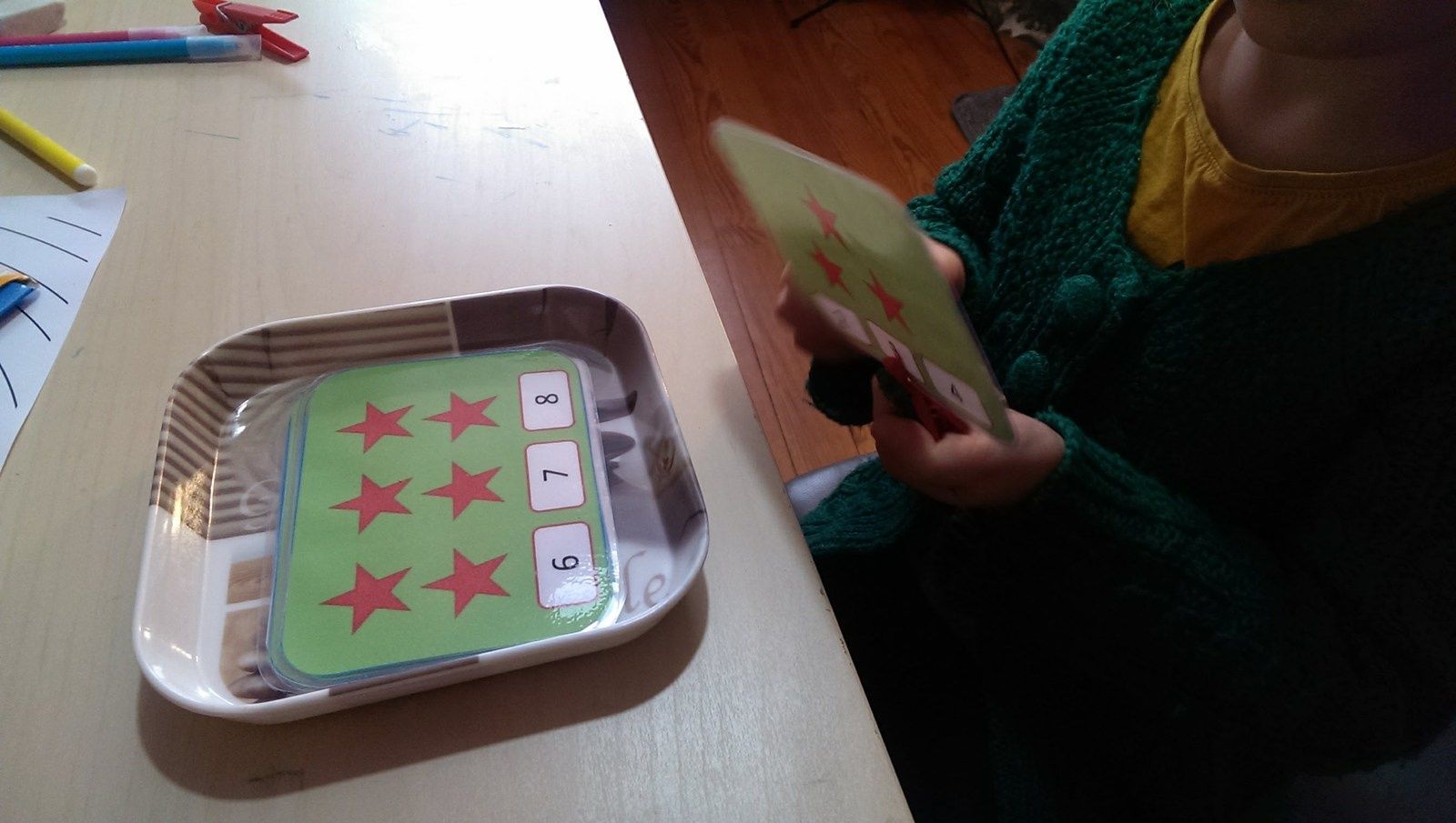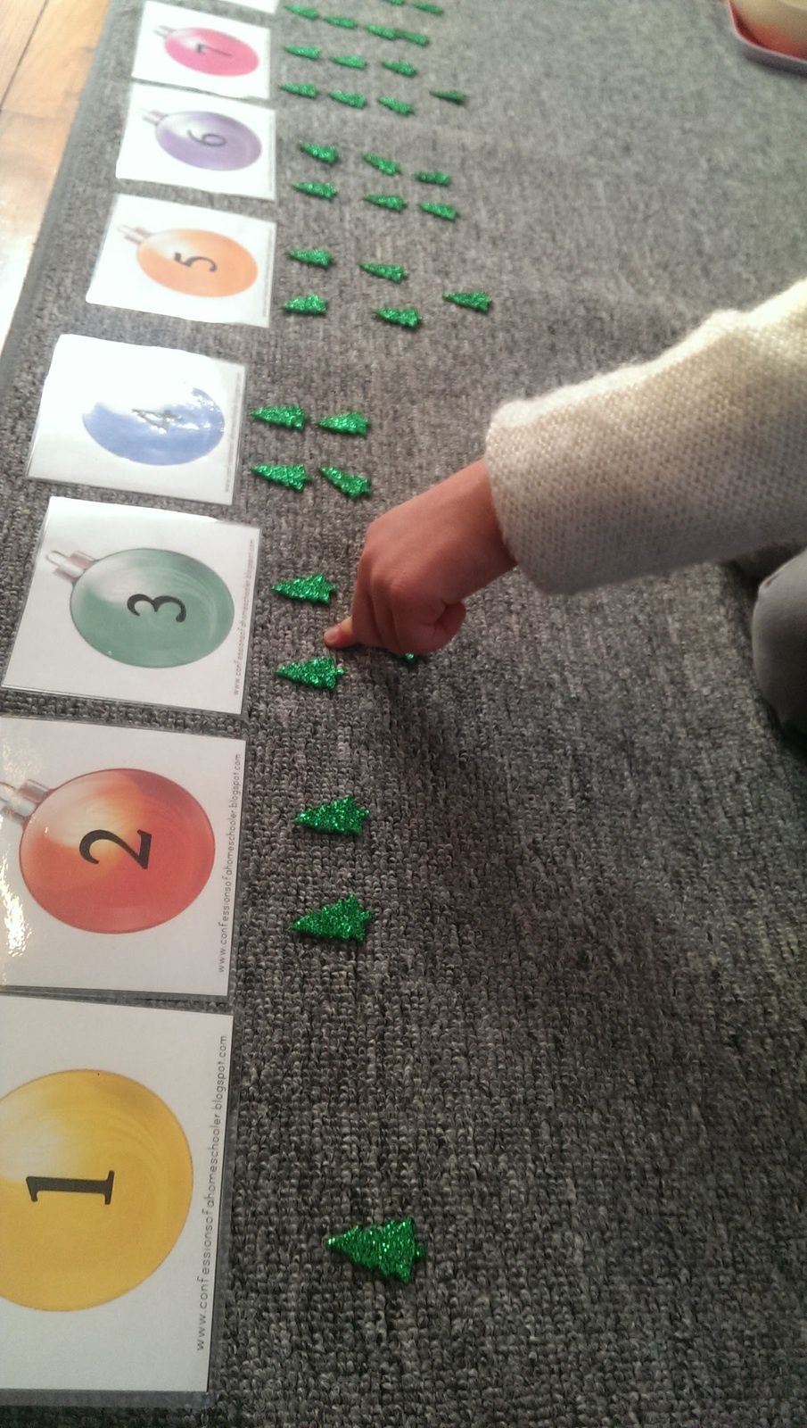 Un petit jeu sur la petite numération pour Malou : elle pioche une carte et doit mettre le nombre correspondant de boules sur son sapin.