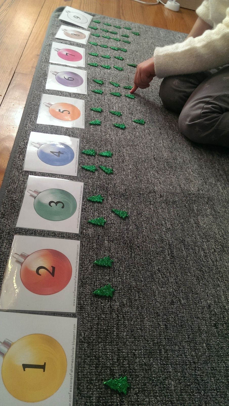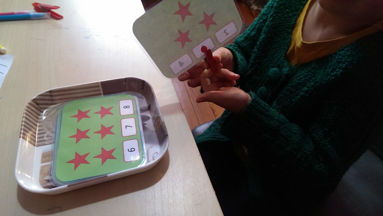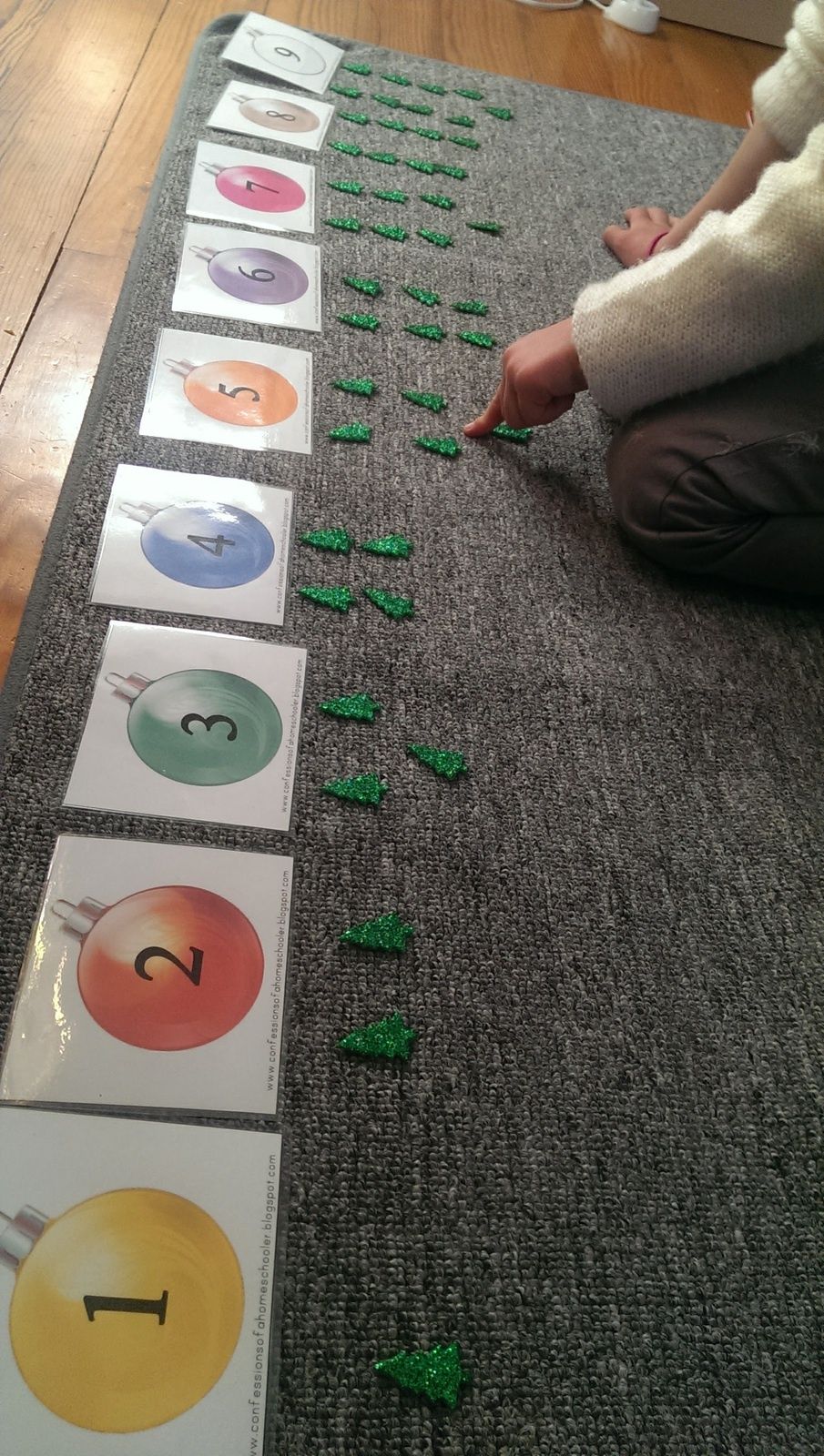 Un petit jeu sur la petite numération pour Malou : elle pioche une carte et doit mettre le nombre correspondant de boules sur son sapin.