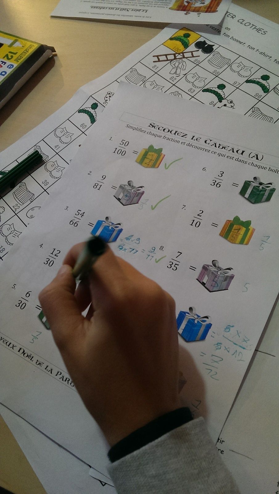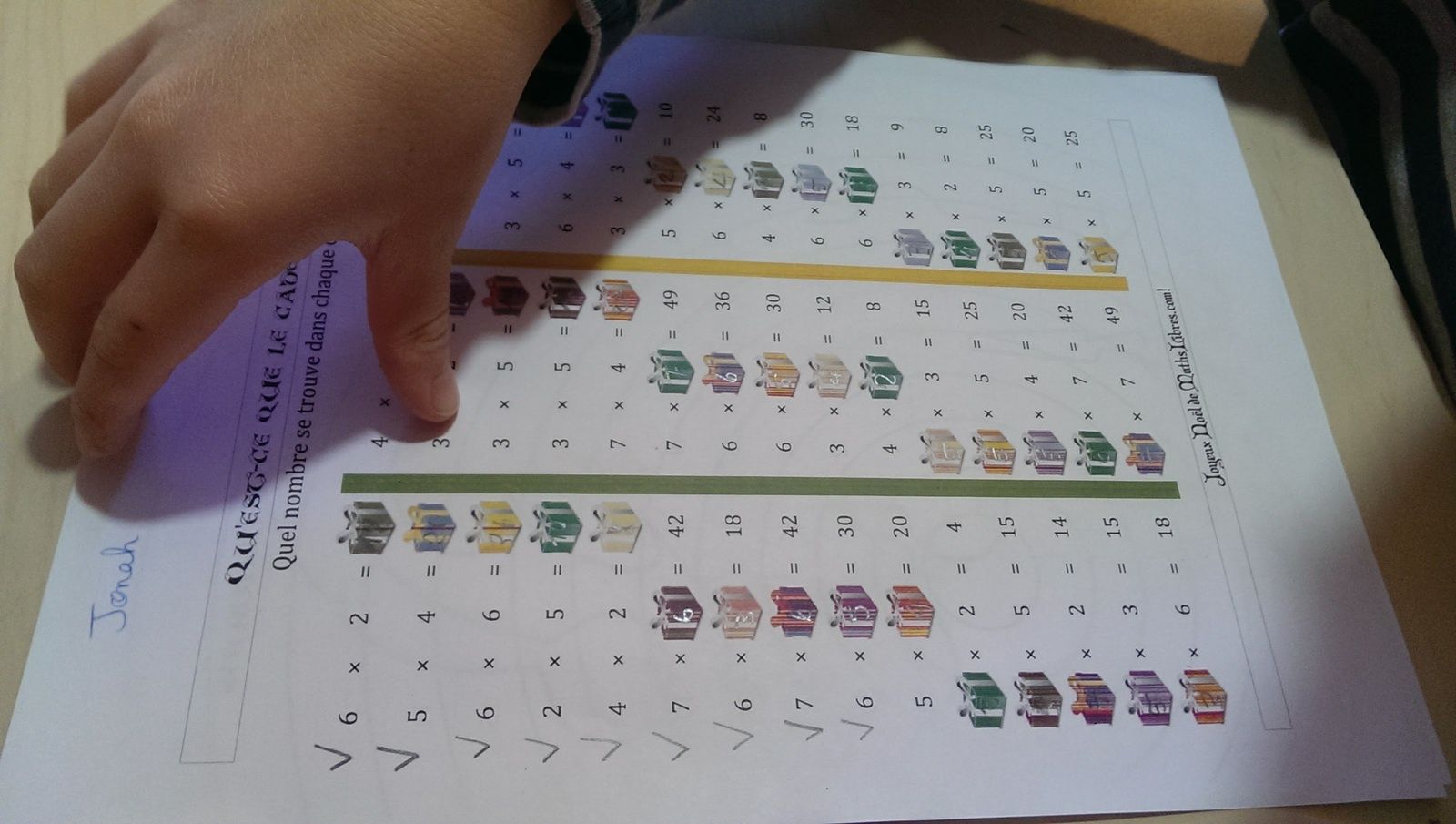 Sur le site de Maths libres que j'aime beaucoup, j'ai imprimé des fiches de calculs pour chacun de mes enfants. Des additions pour Alana, des multiplications pour Jonah, des divisions pour Mathieu et des fractions à réduire pour Lucas. J'en ai fait un rituel. Chaque jour, les enfants ont une fiche d'opérations à remplir (ou une colonne au moins, s'ils trouvent l'exercice trop long.) J'ai imprimé les corrections au verso de chaque feuille. Les enfants se corrigent seuls.