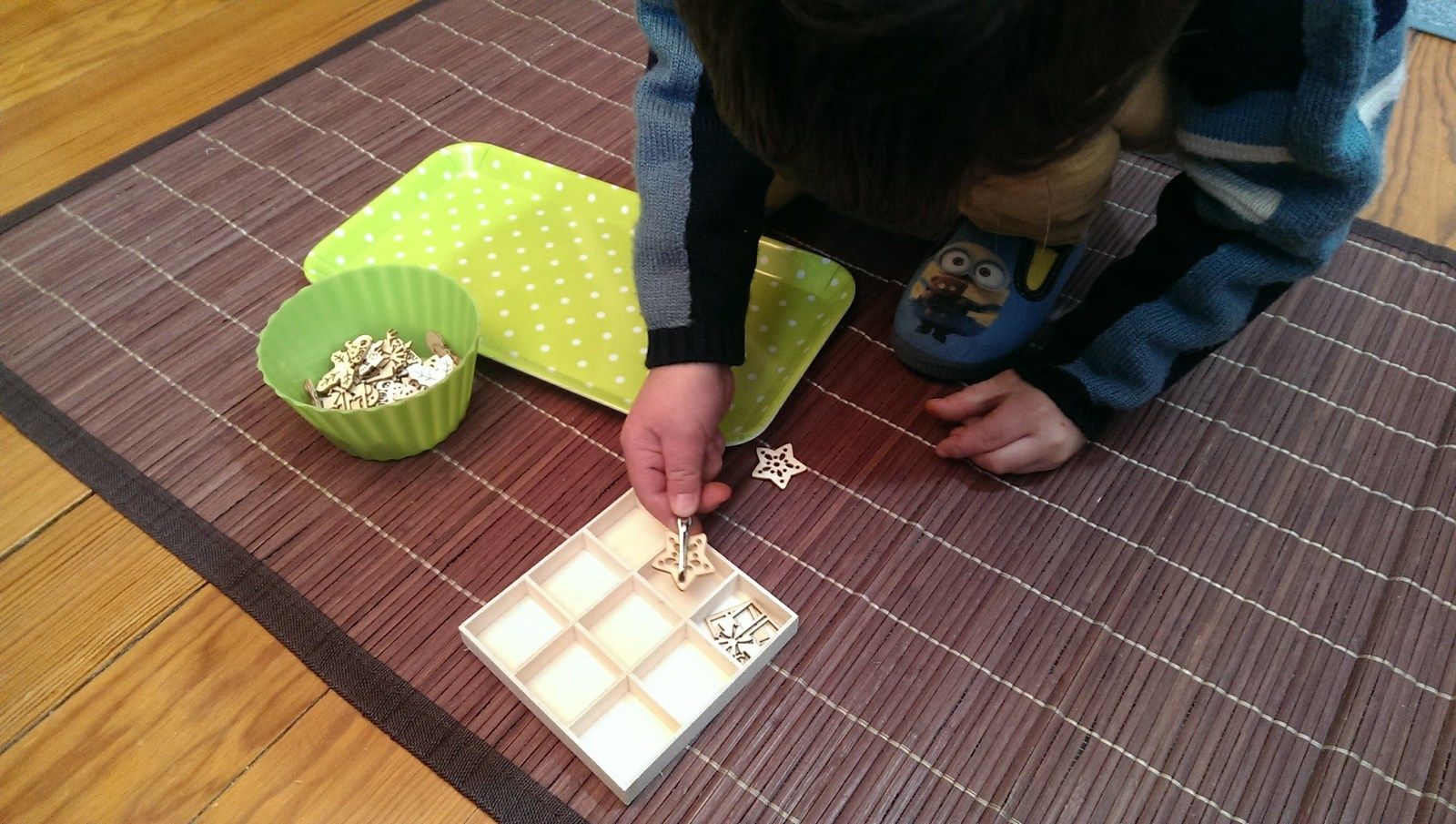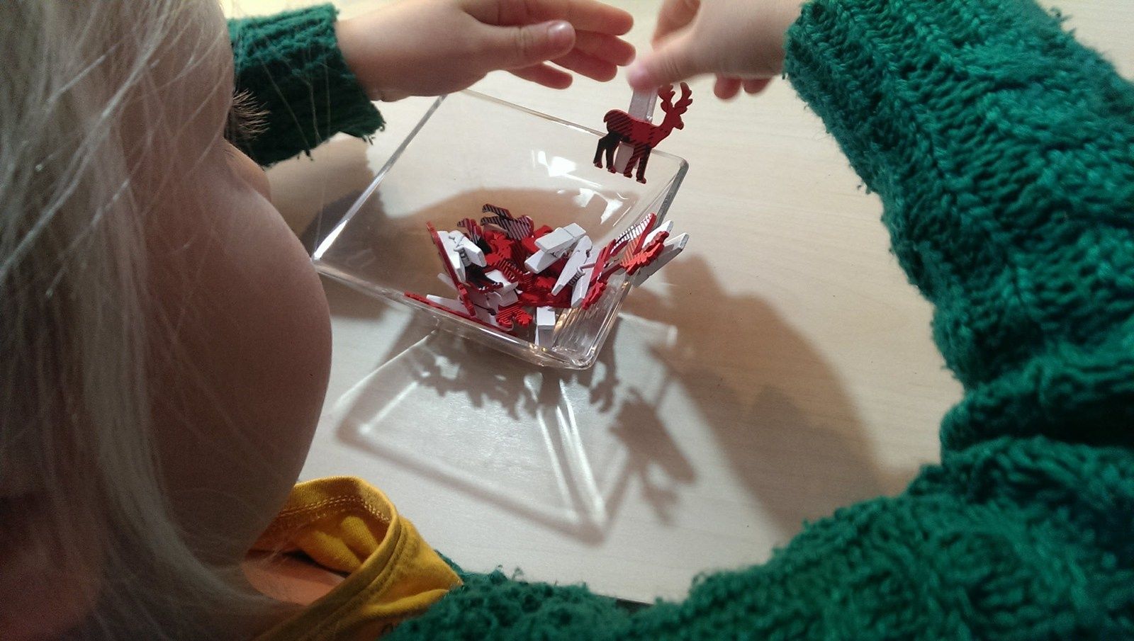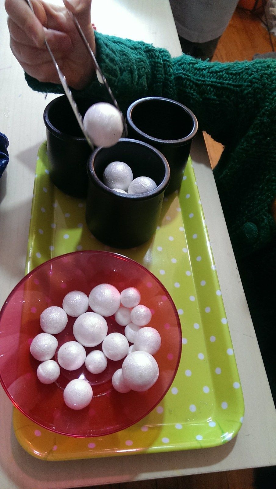 Motricité fine pour Zian : enfiler les petites boules de Noël sur un fil chenille.