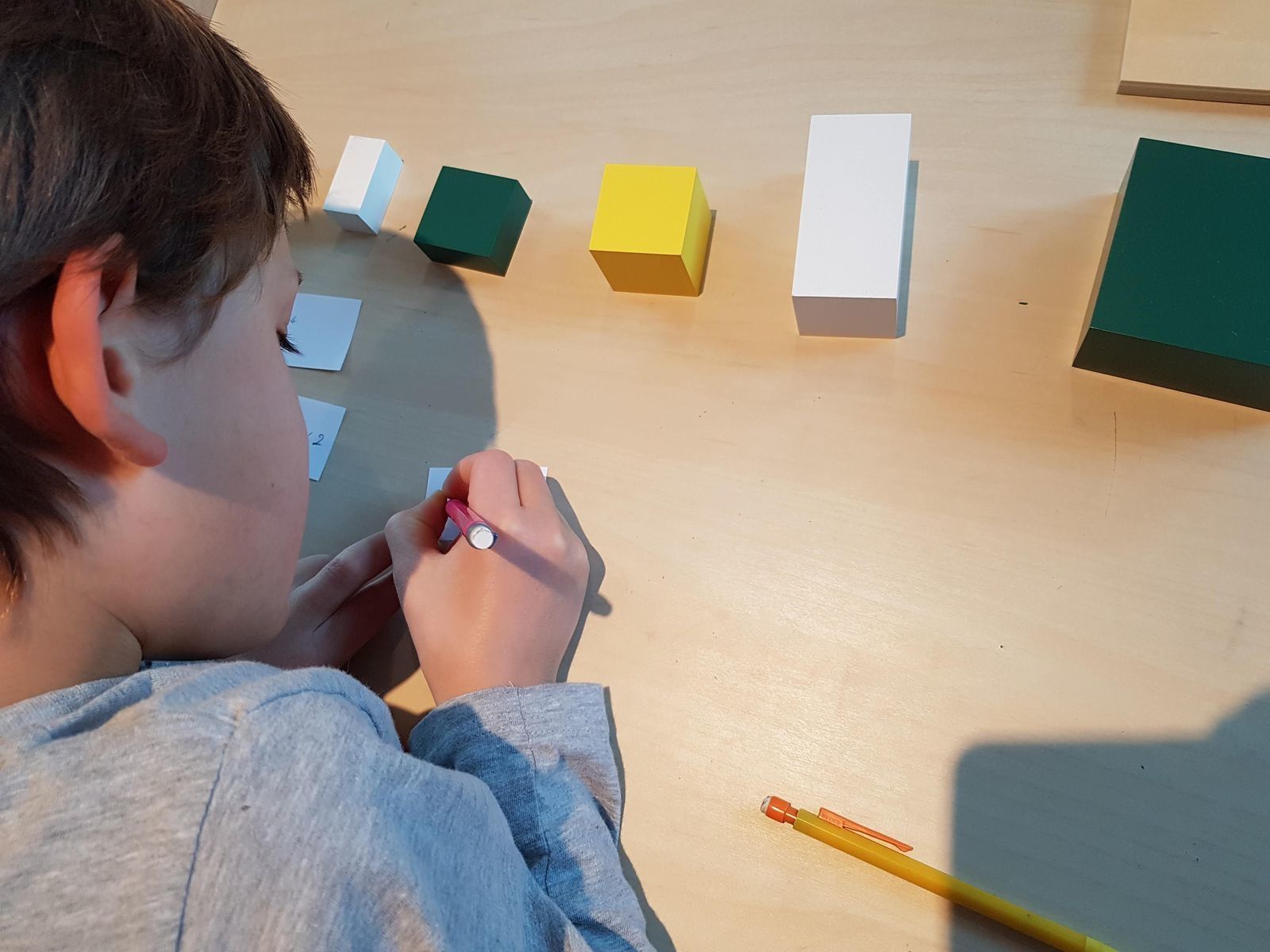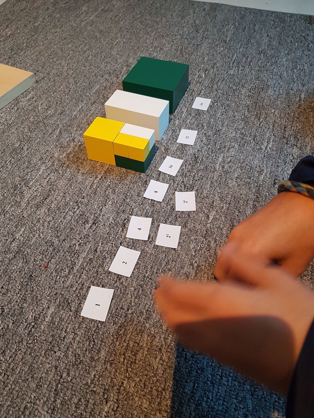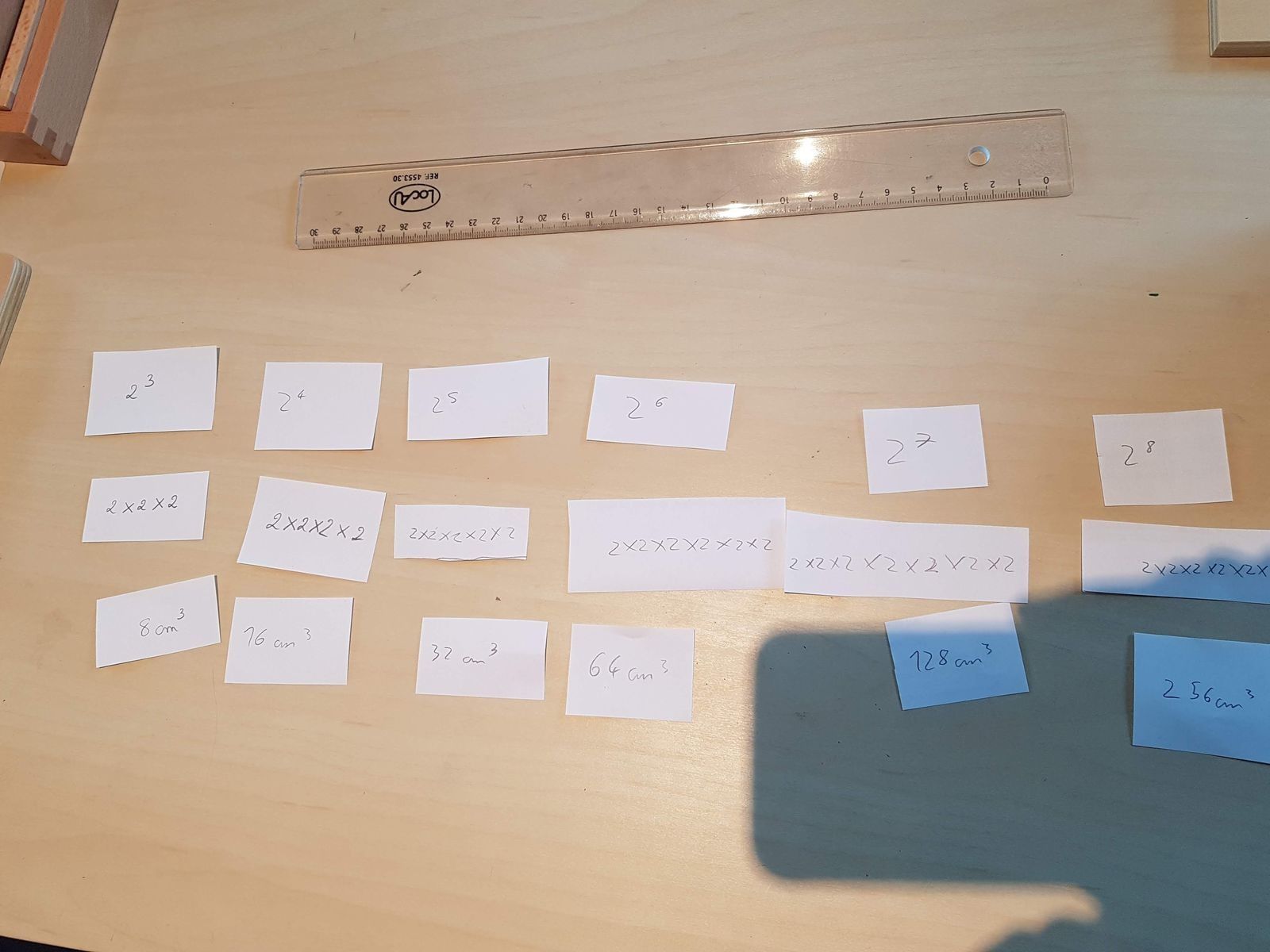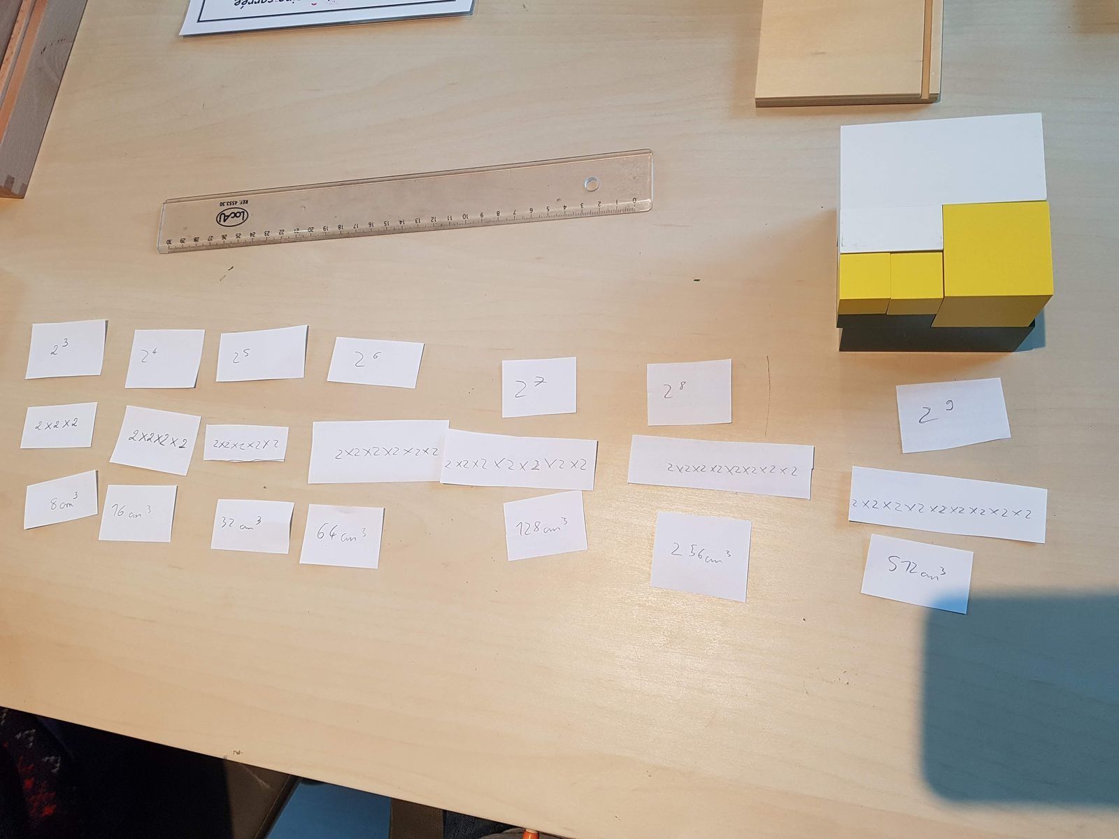 Avec les petites et les grandes chaînes de perles Montessori, les enfants ont découvert les nombres au carré et au cube, donc la notion de puissance.
