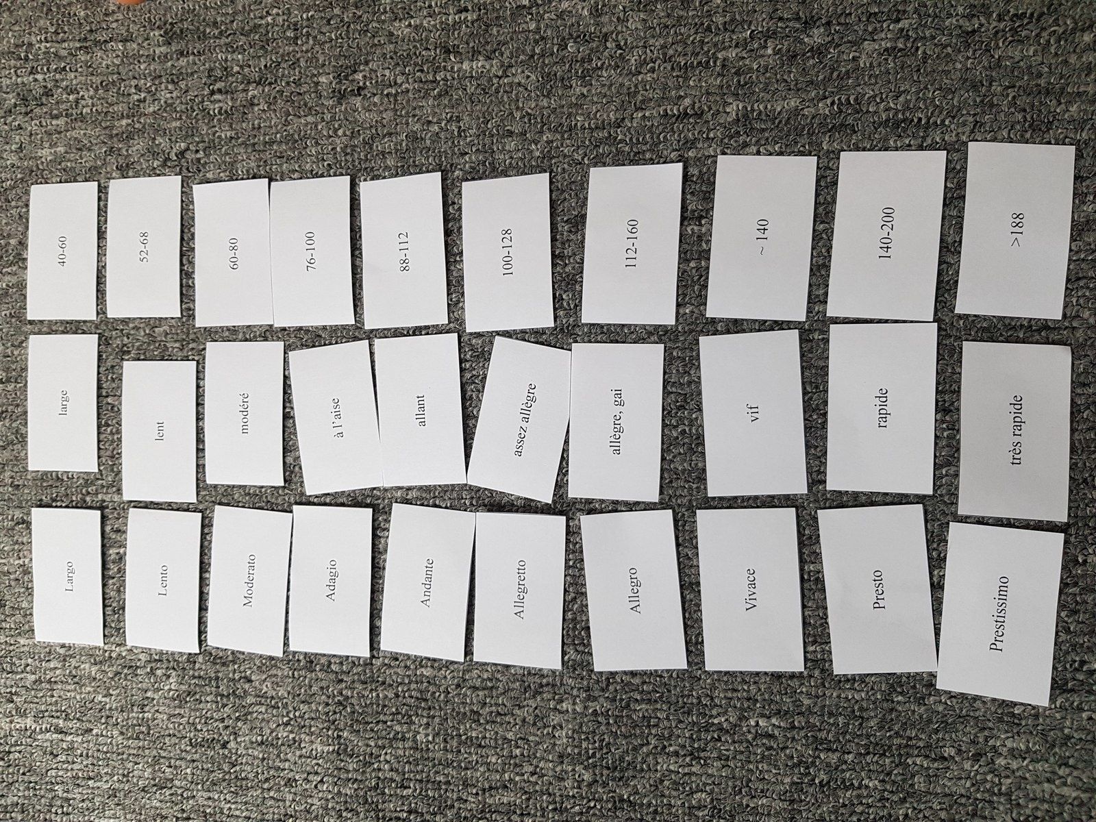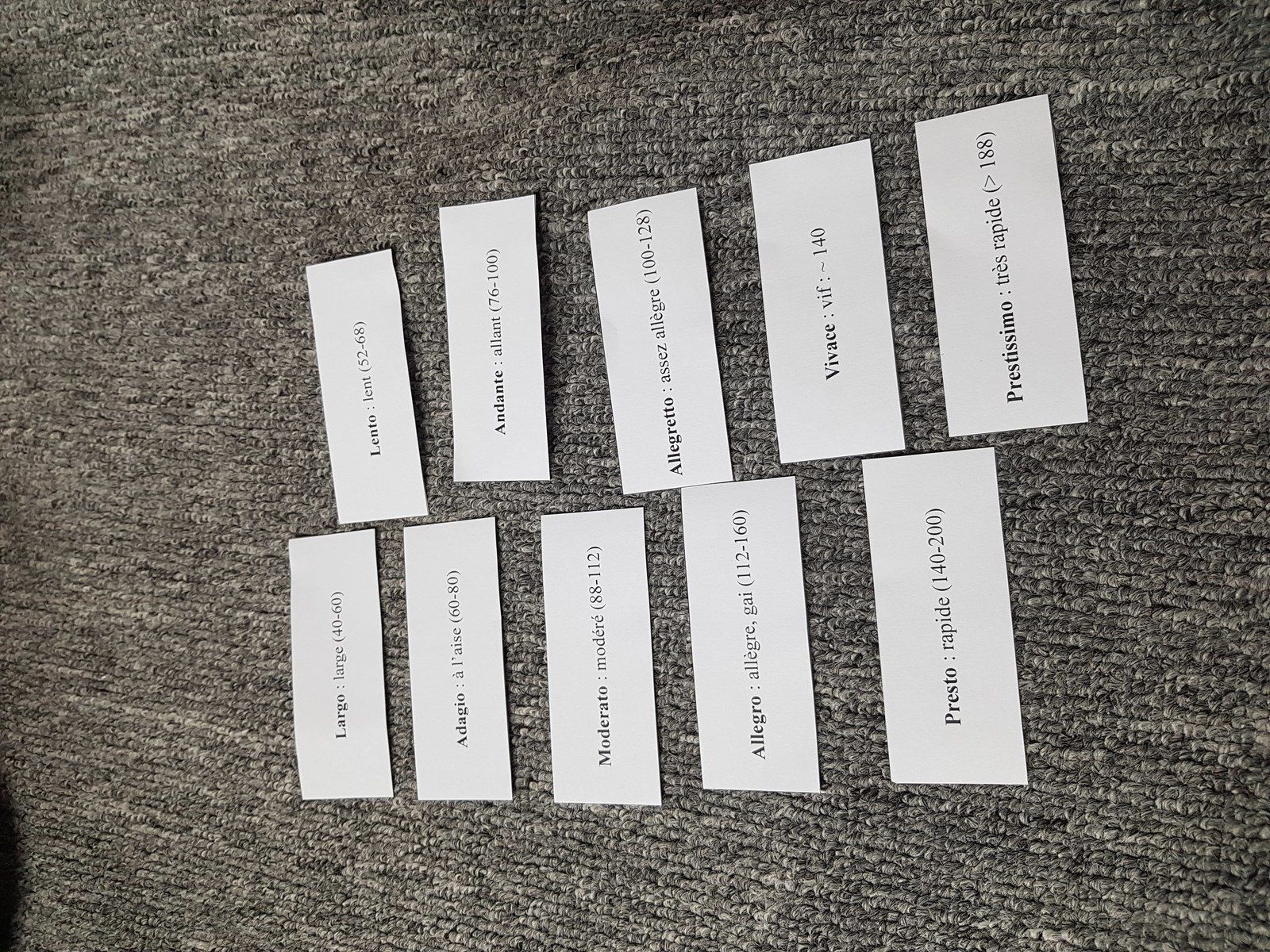 Je leur ai ensuite proposé ces petites étiquettes : essayer de les classer dans l'ordre, du tempo le plus lent au tempo le plus rapide.
