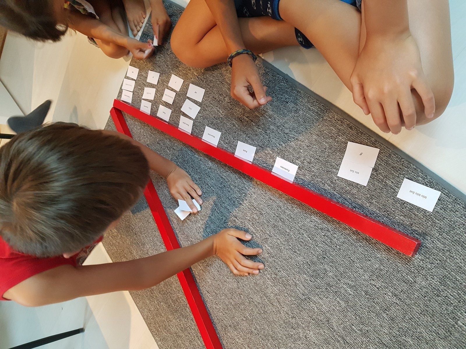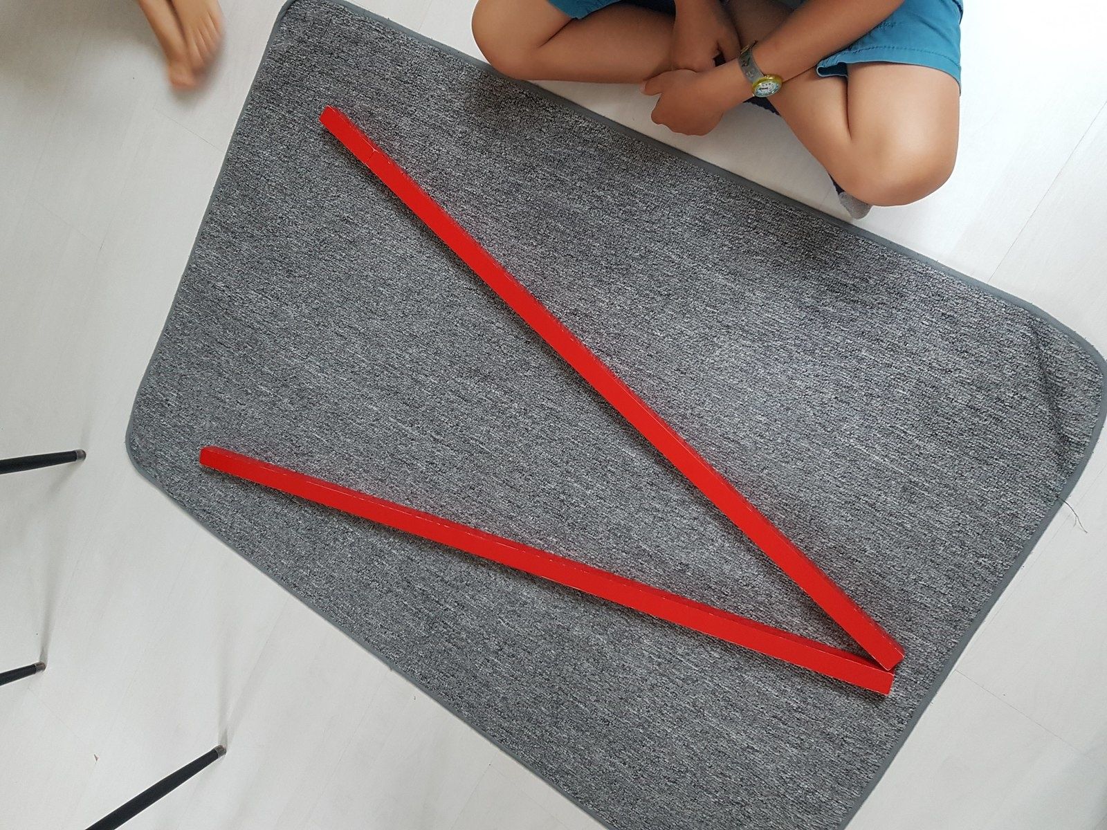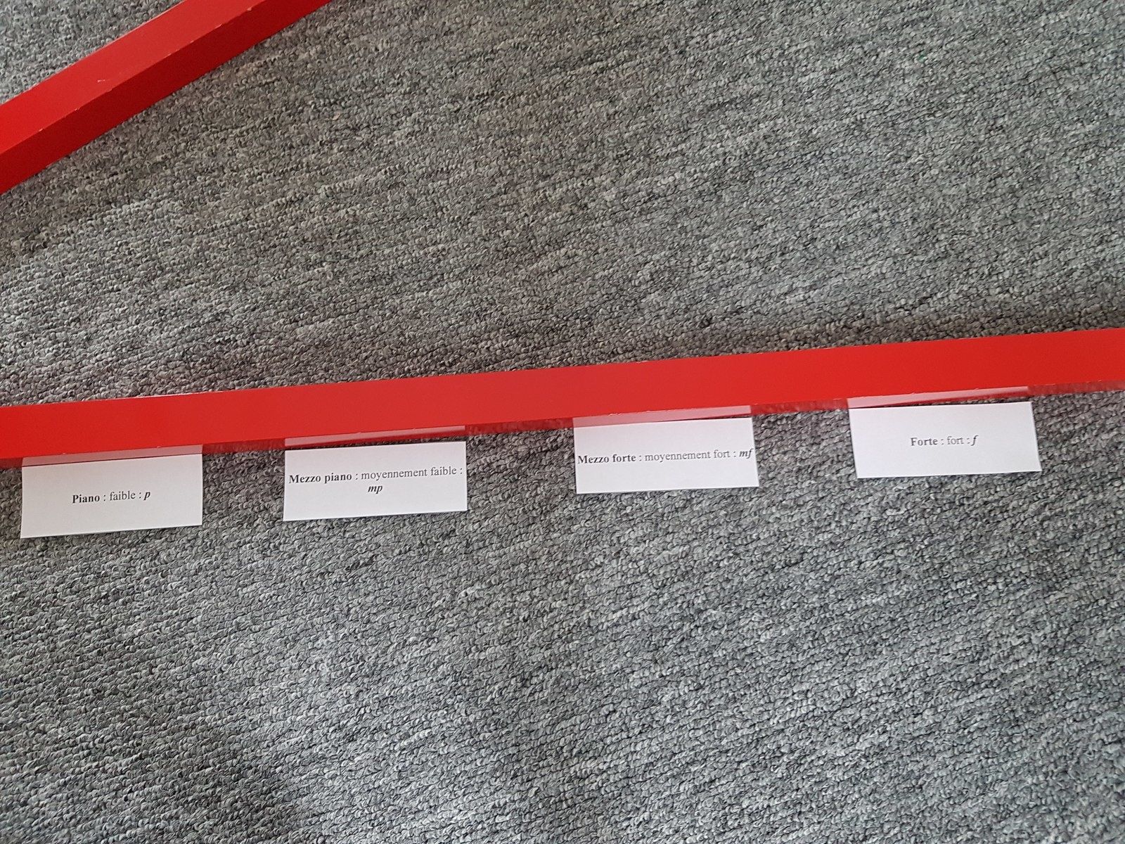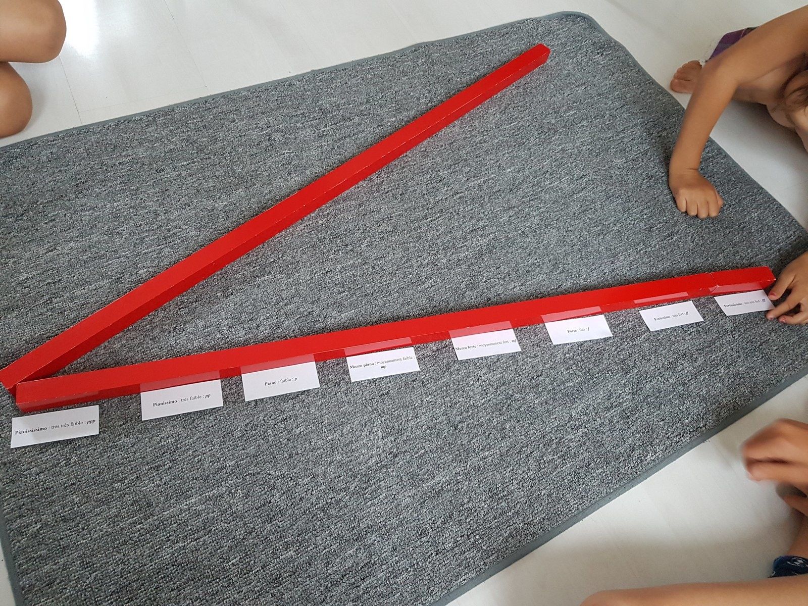 Puis en classant des étiquettes de la nuance la plus douce à la nuance la plus forte. Nous avons utilisé les barres rouges Montessori pour indiquer le crescendo ou le decrescendo.