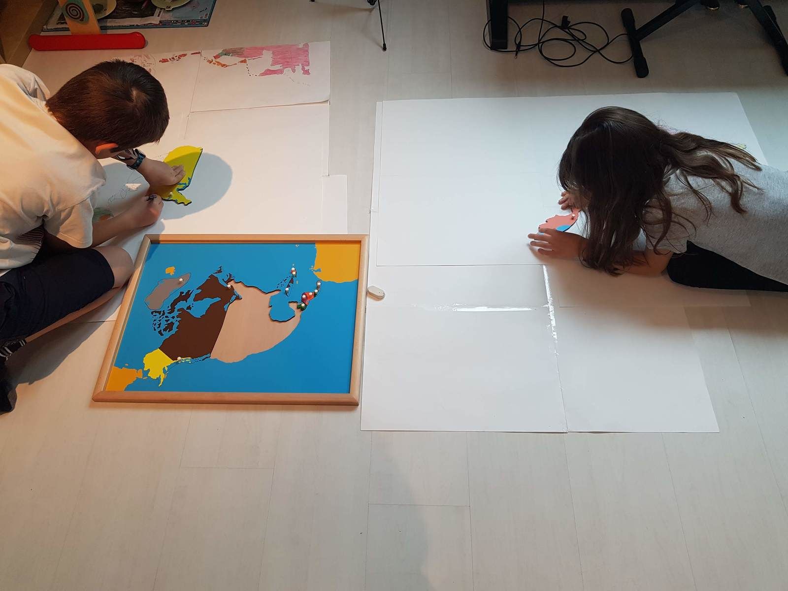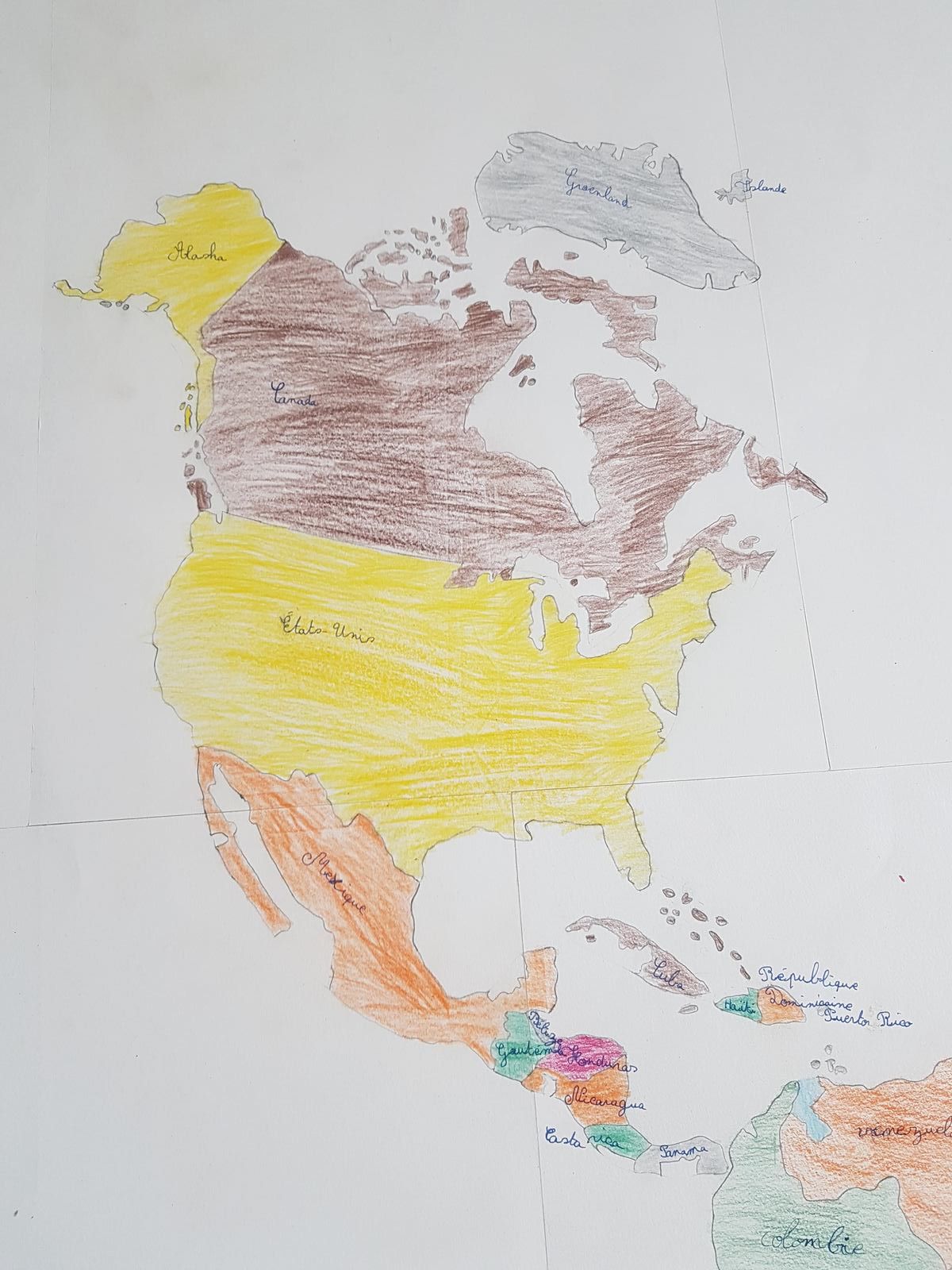 Jonah et Alana ont décidé, il y a quelques semaines, de créer une grande carte du monde grâce aux puzzles Montessori. Il nous manque encore l'Océanie pour que leur carte soit complète. Je l'achèterais probablement le mois prochain. Cette semaine, ils ont pu faire l'Amérique du Nord.