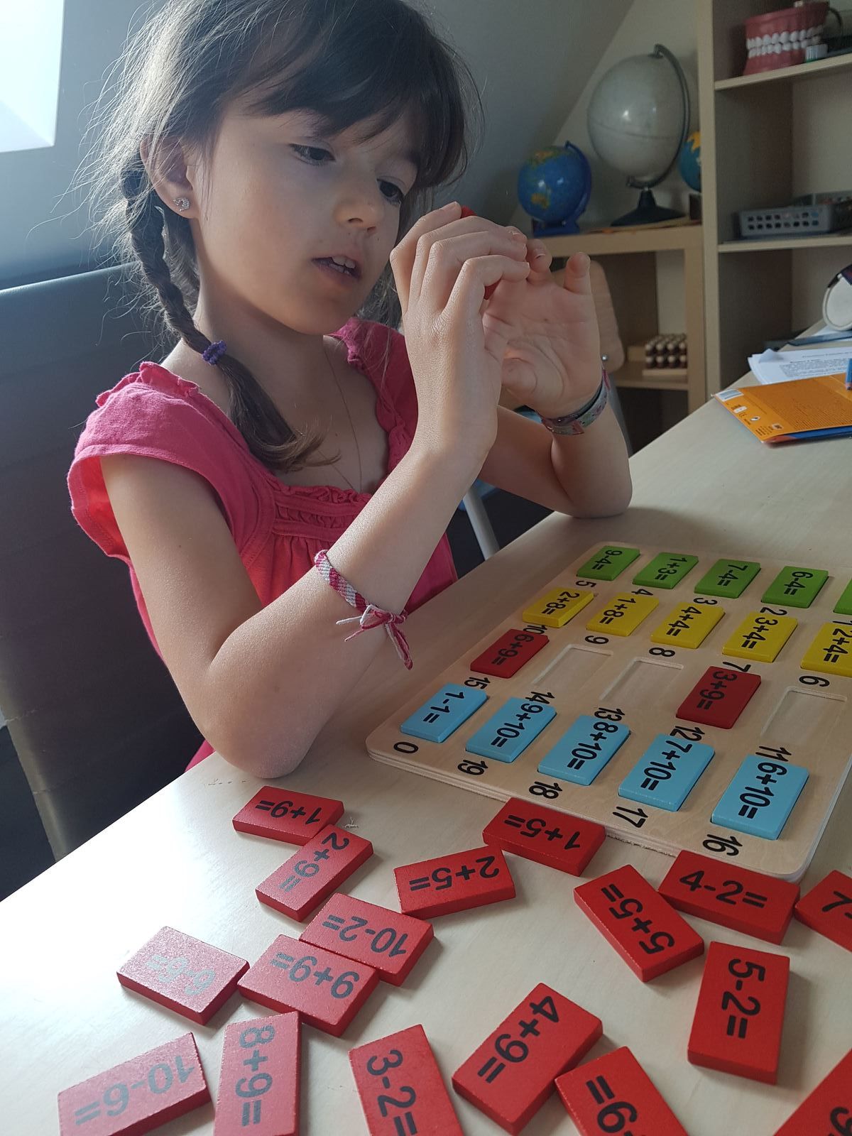 Elle maîtrise les doubles et les compléments à 10, mais pour le reste, c'est plus dur. Je voulais qu'elle ait un nouveau matériel pour qu'elle retrouve l'envie de calculer et qu'elle réfléchisse à une manière de calculer plus efficace, en passant par les compléments à 10 ou les doubles.