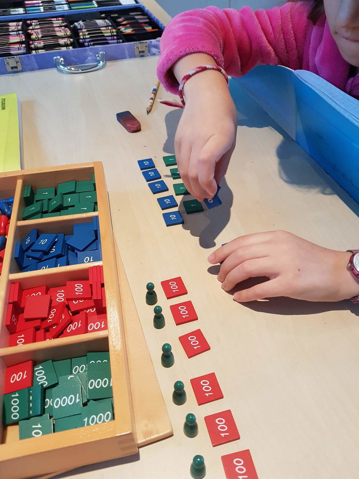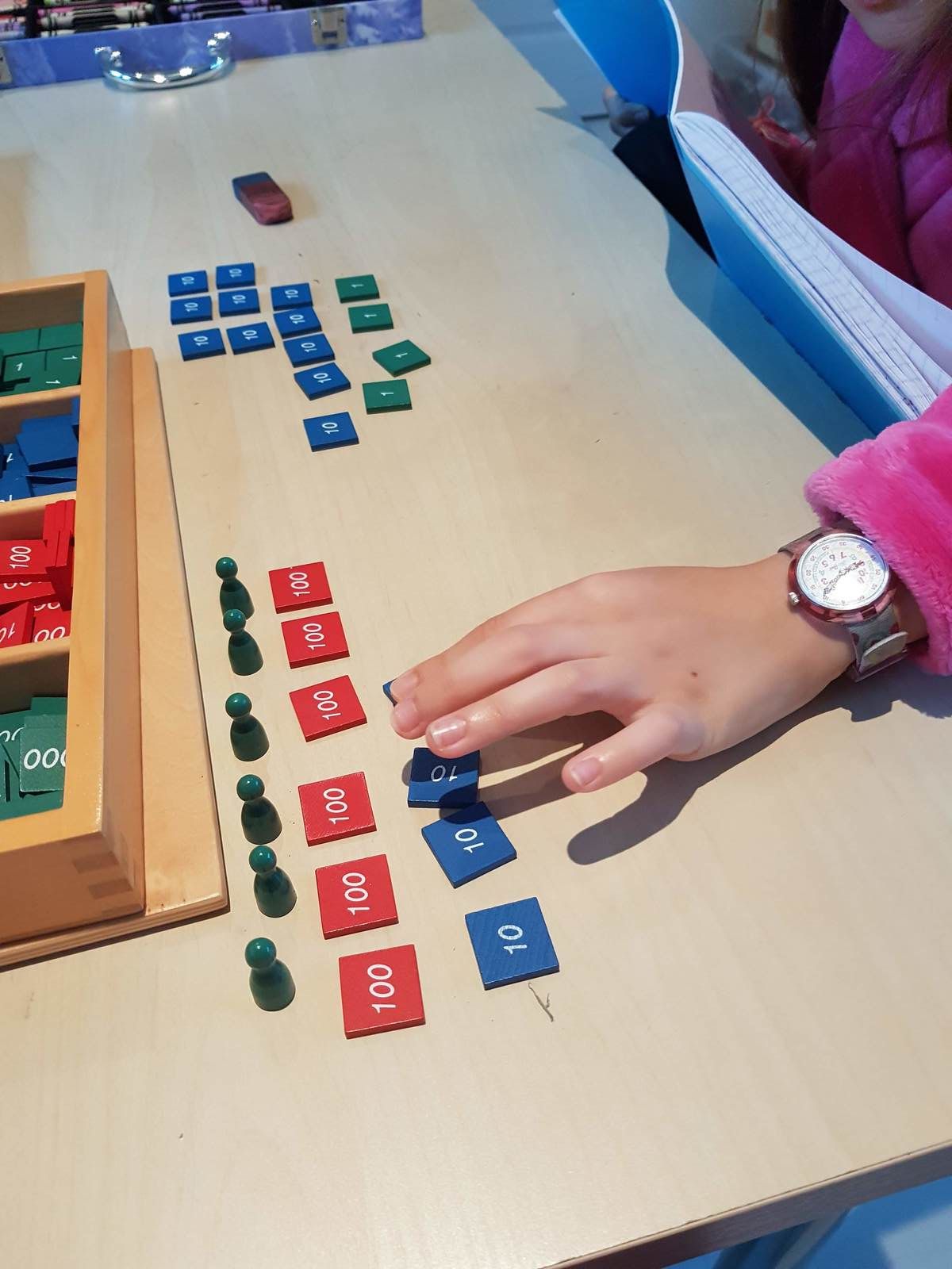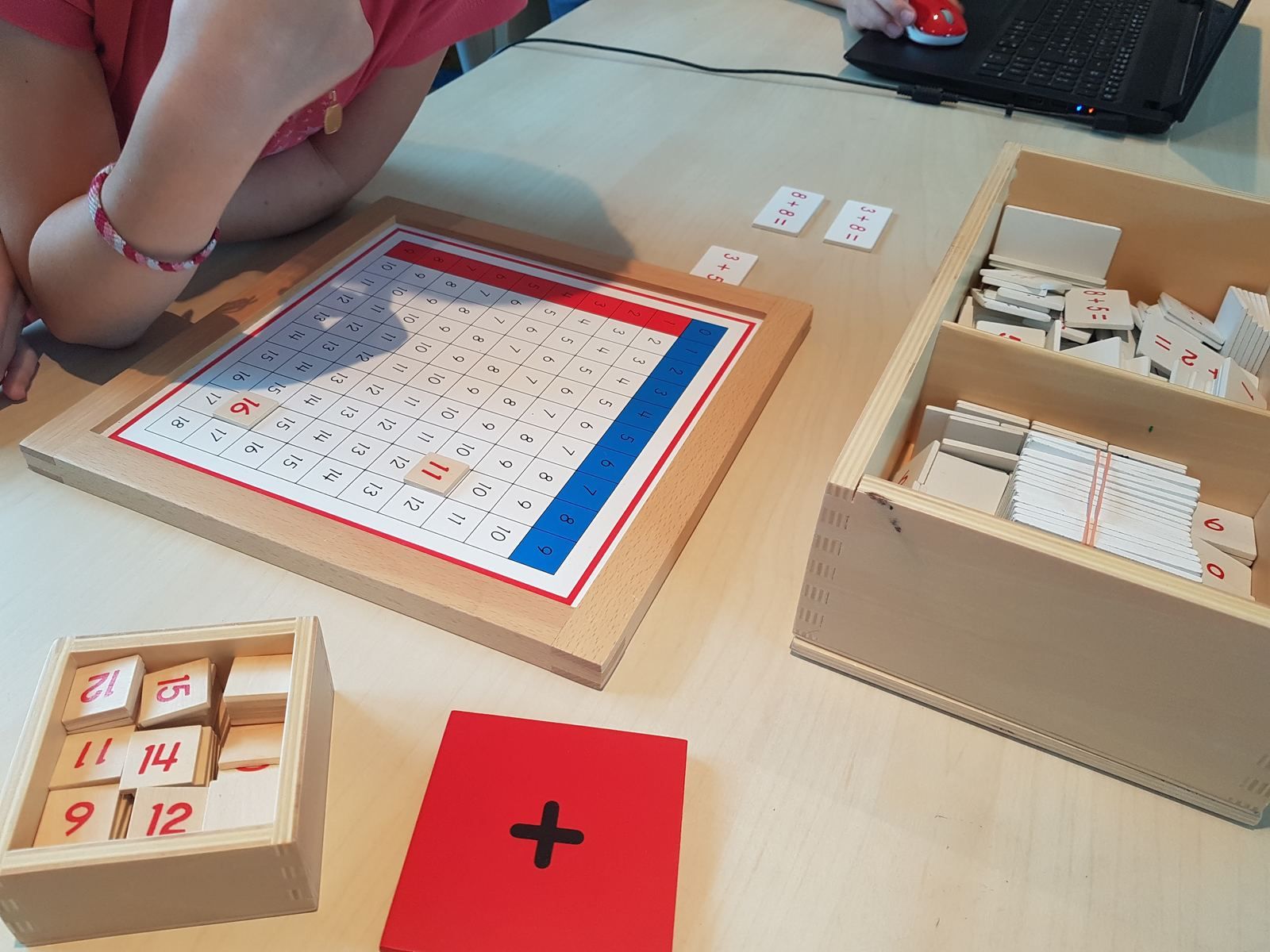 Un autre jour, je lui ai demandé de refaire le tableau de l'addition Montessori : piocher des opérations et placer le résultat dans le tableau.