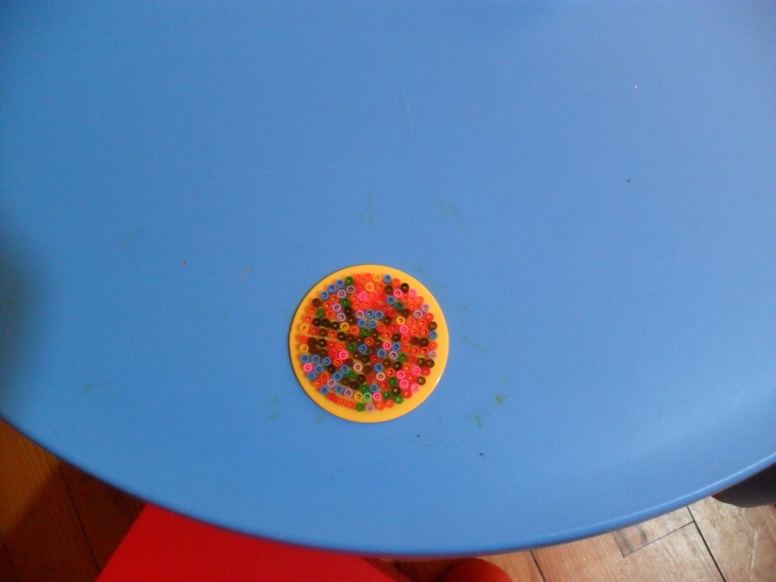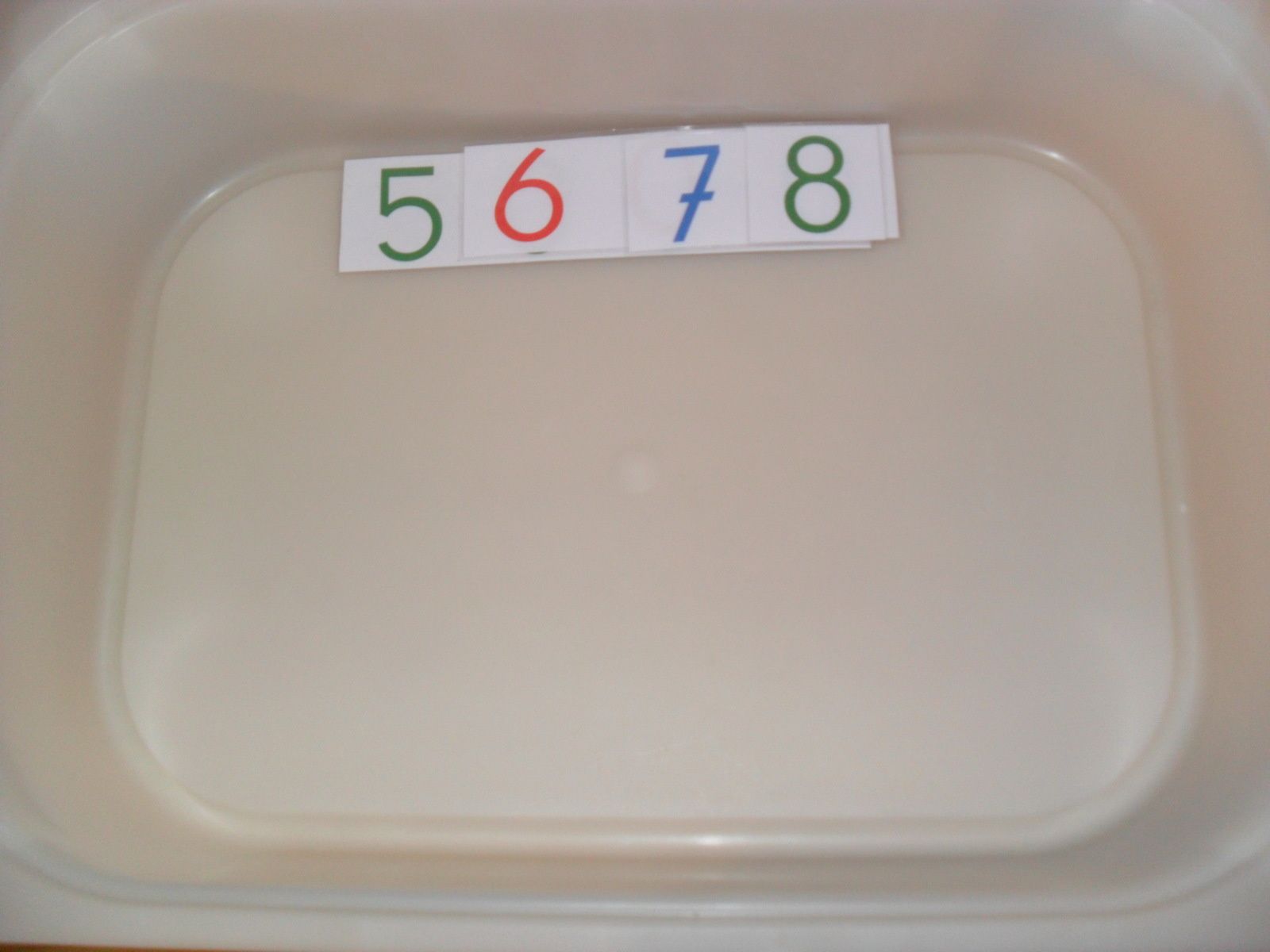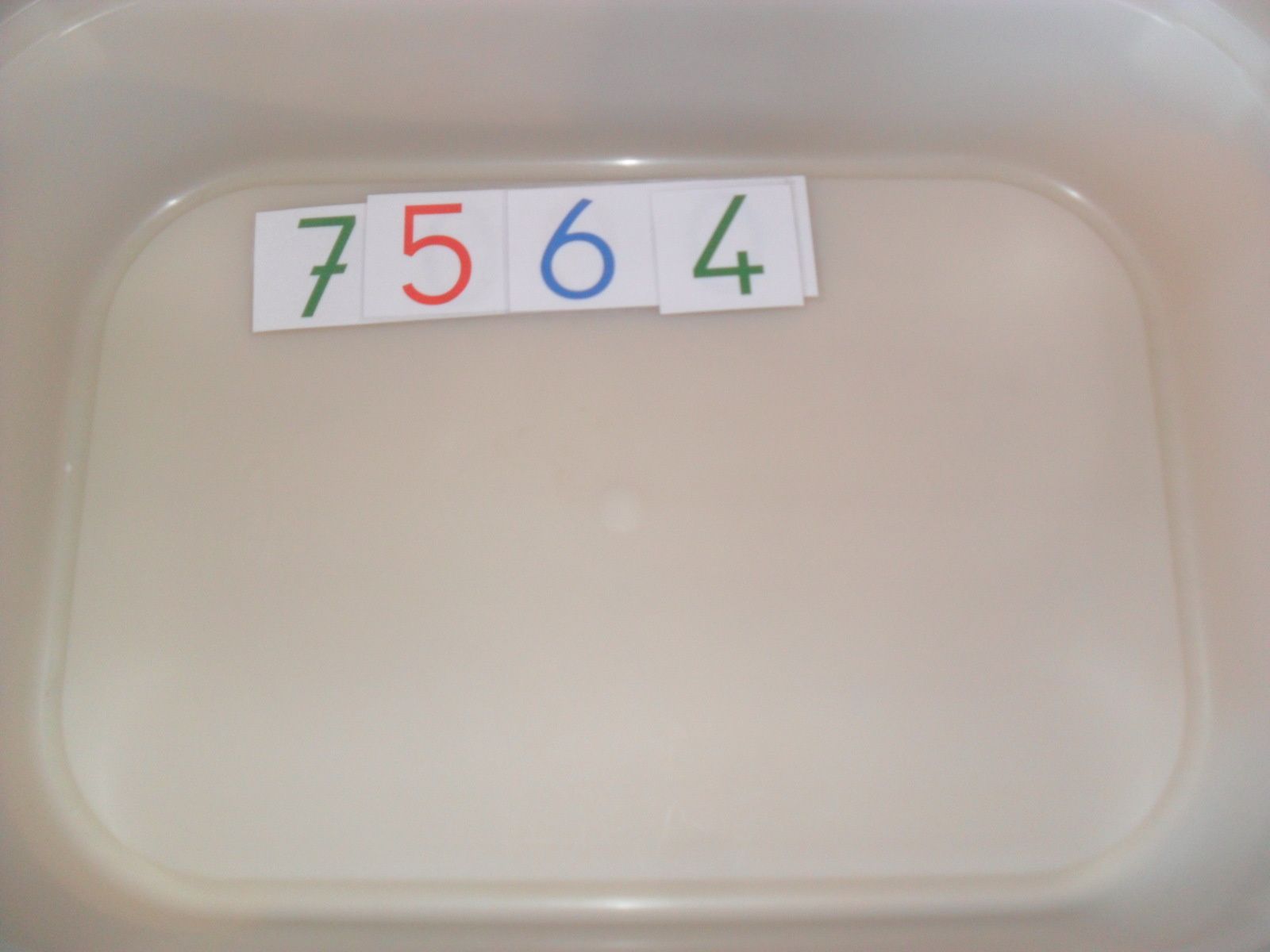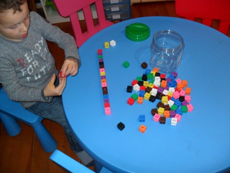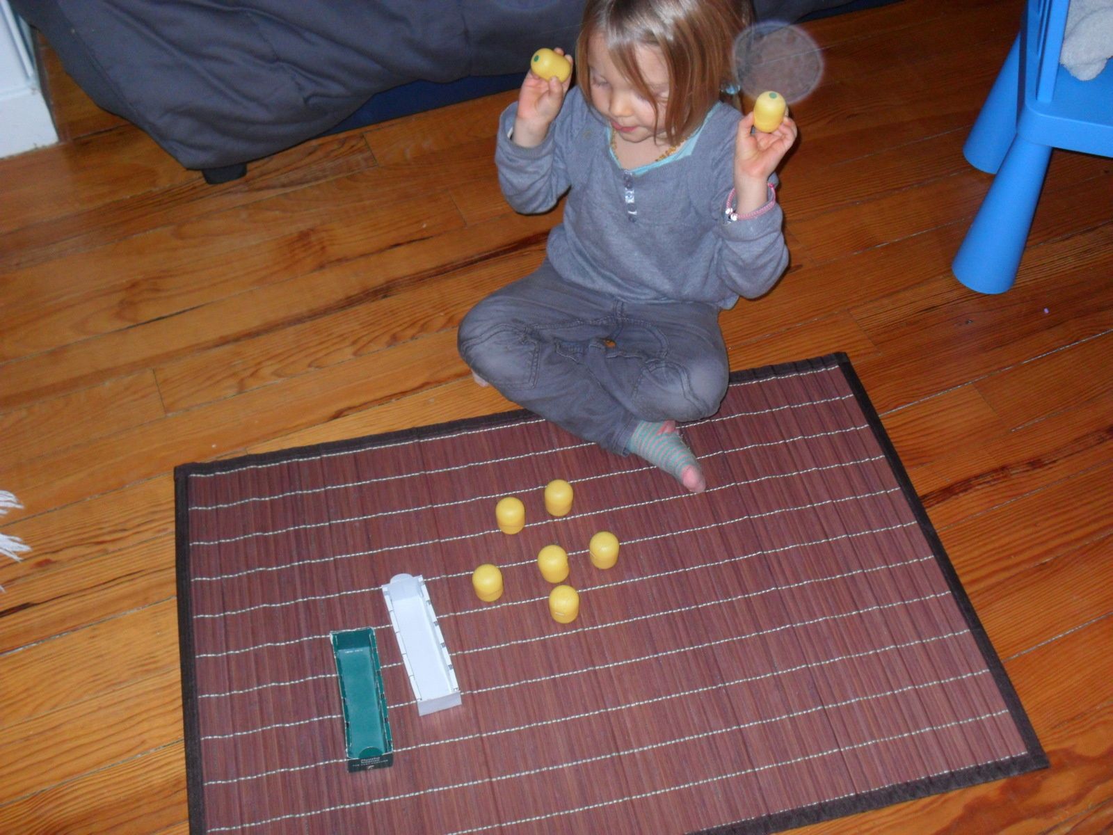 Je lui ai demandé de former le nombre du plateau blanc avec les perles Montessori.