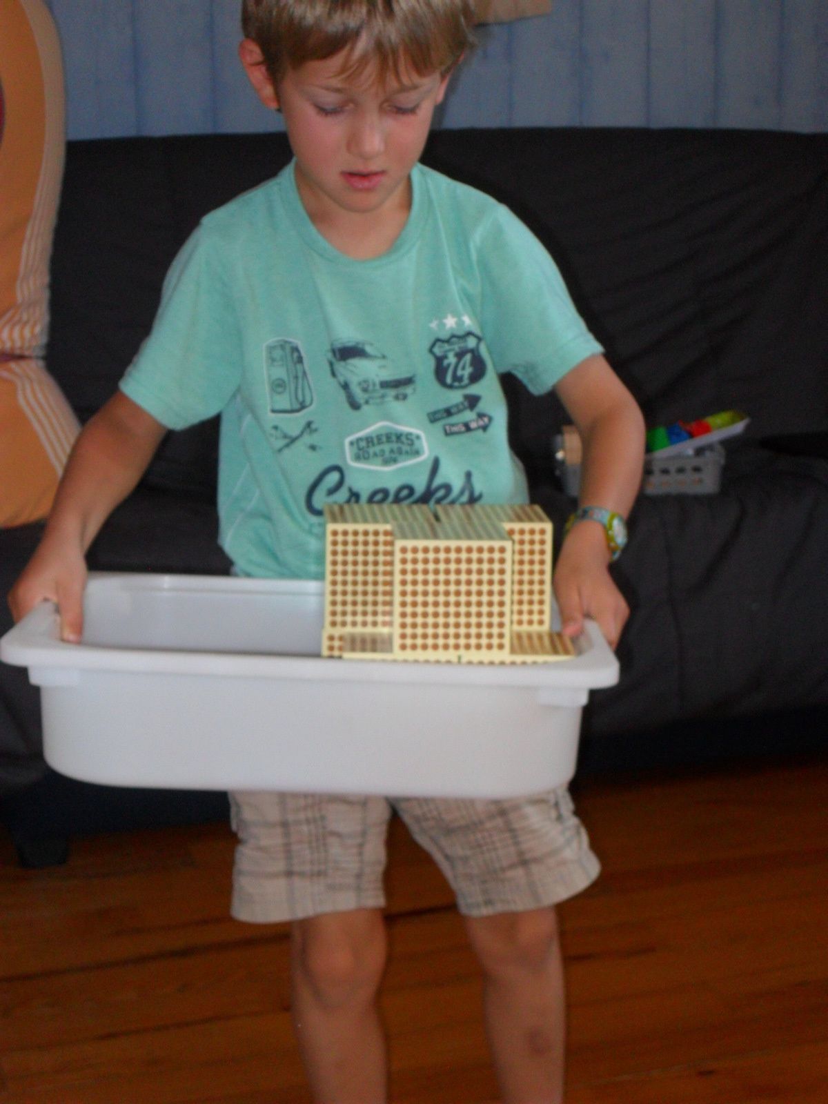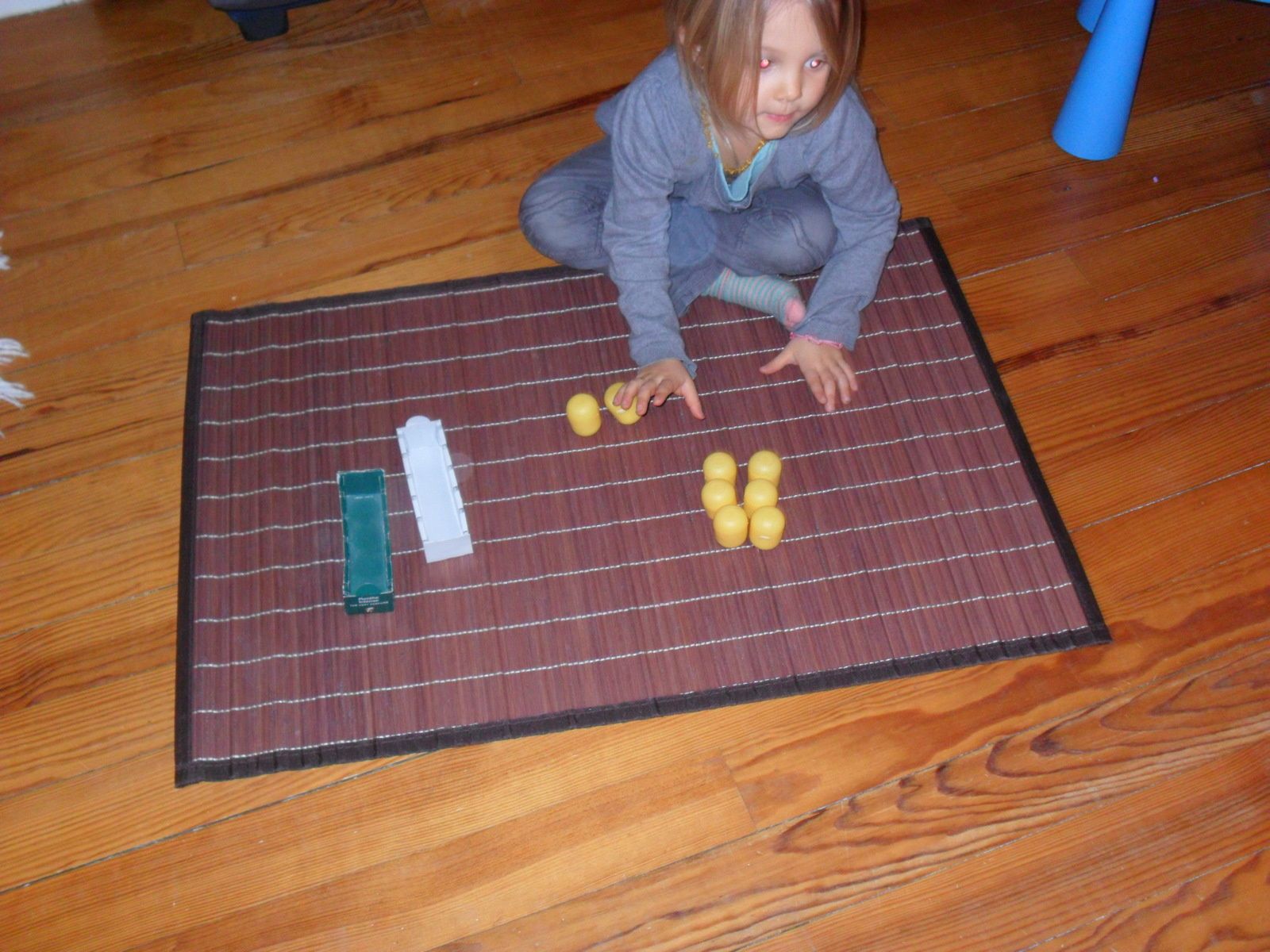 Je lui ai ensuite demandé de donner au deuxième plateau le nombre de perles indiqué (on enlève ce nombre du premier plateau pour le donner au second : on soustrait) :