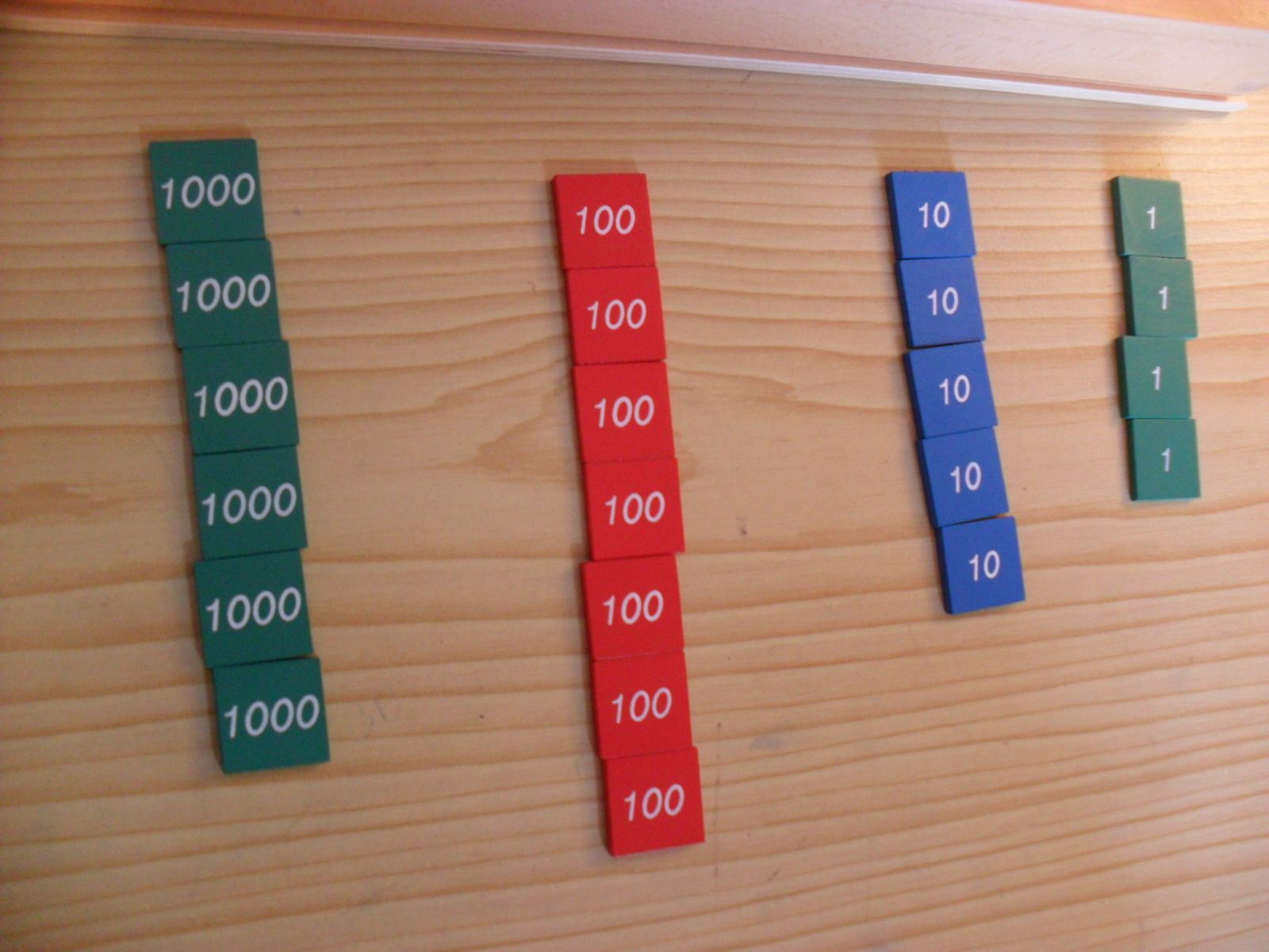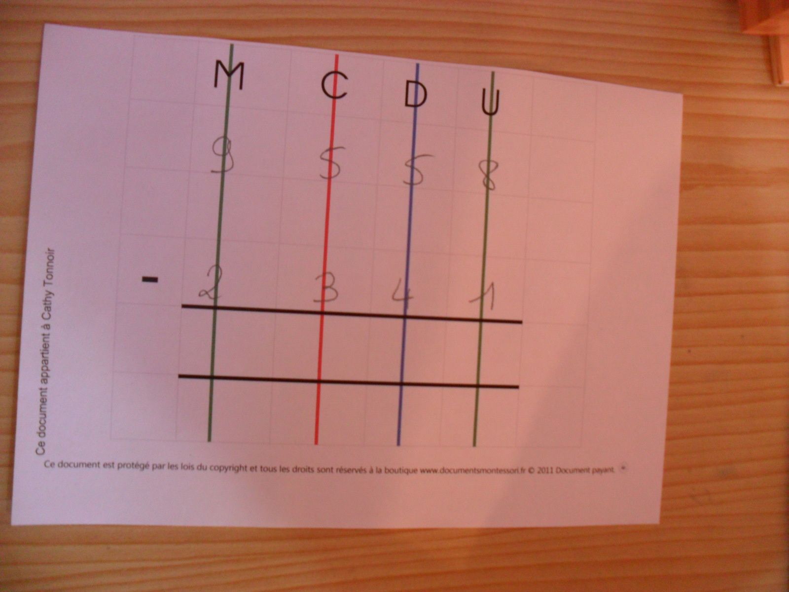 Quand l'enfant s'est bien entraîné sur les soustractions avec les perles, on peut lui présenter la soustraction avec les timbres Montessori.