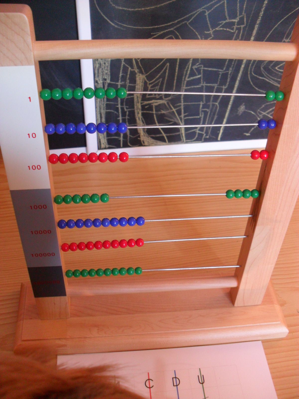 Après les soustractions avec les perles puis les soustractions avec les timbres, on peut présenter à l'enfant les soustractions avec le boulier Montessori.