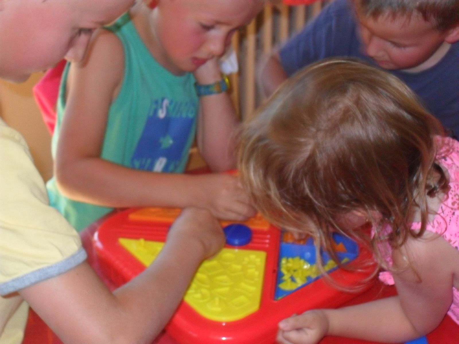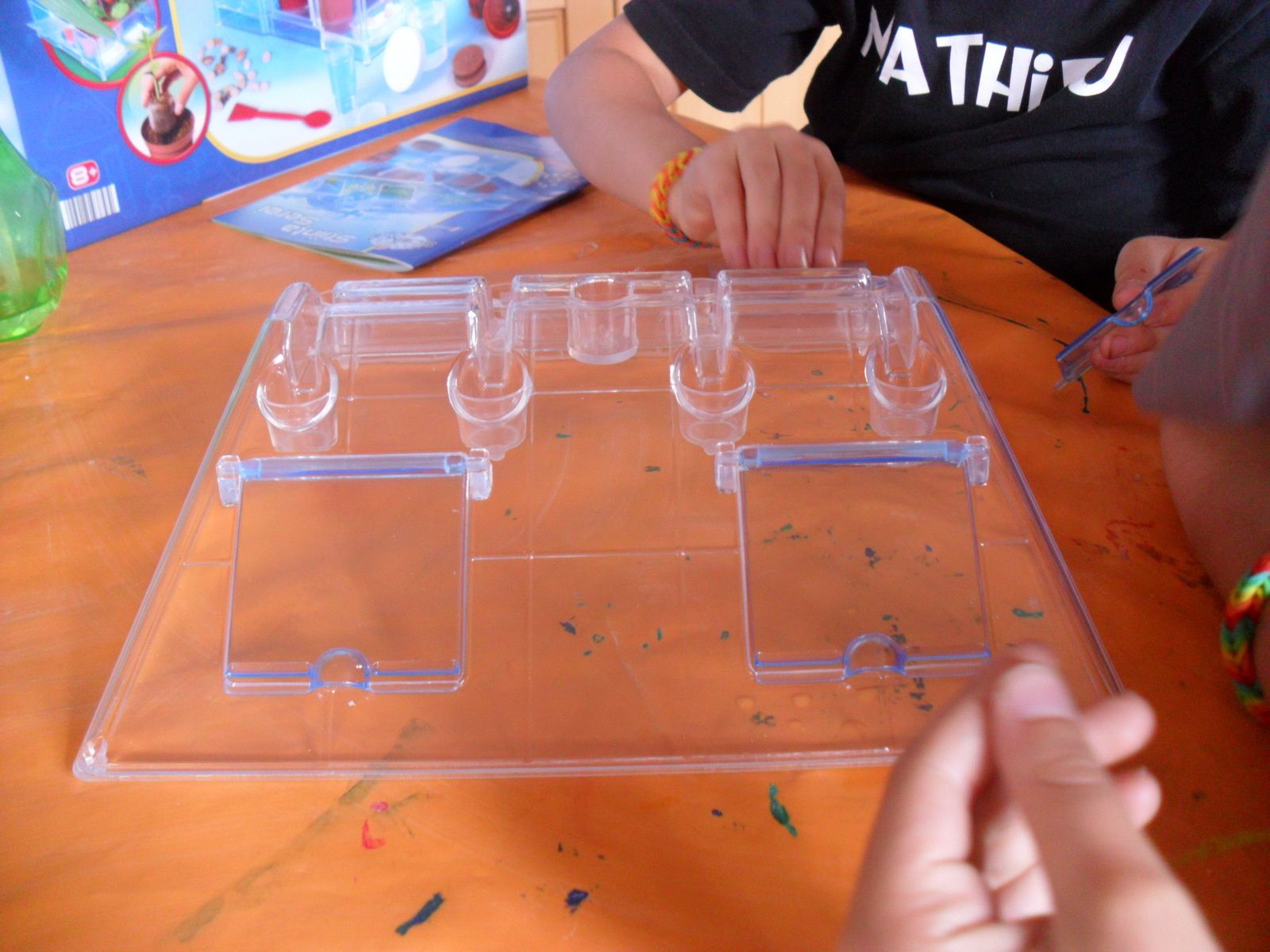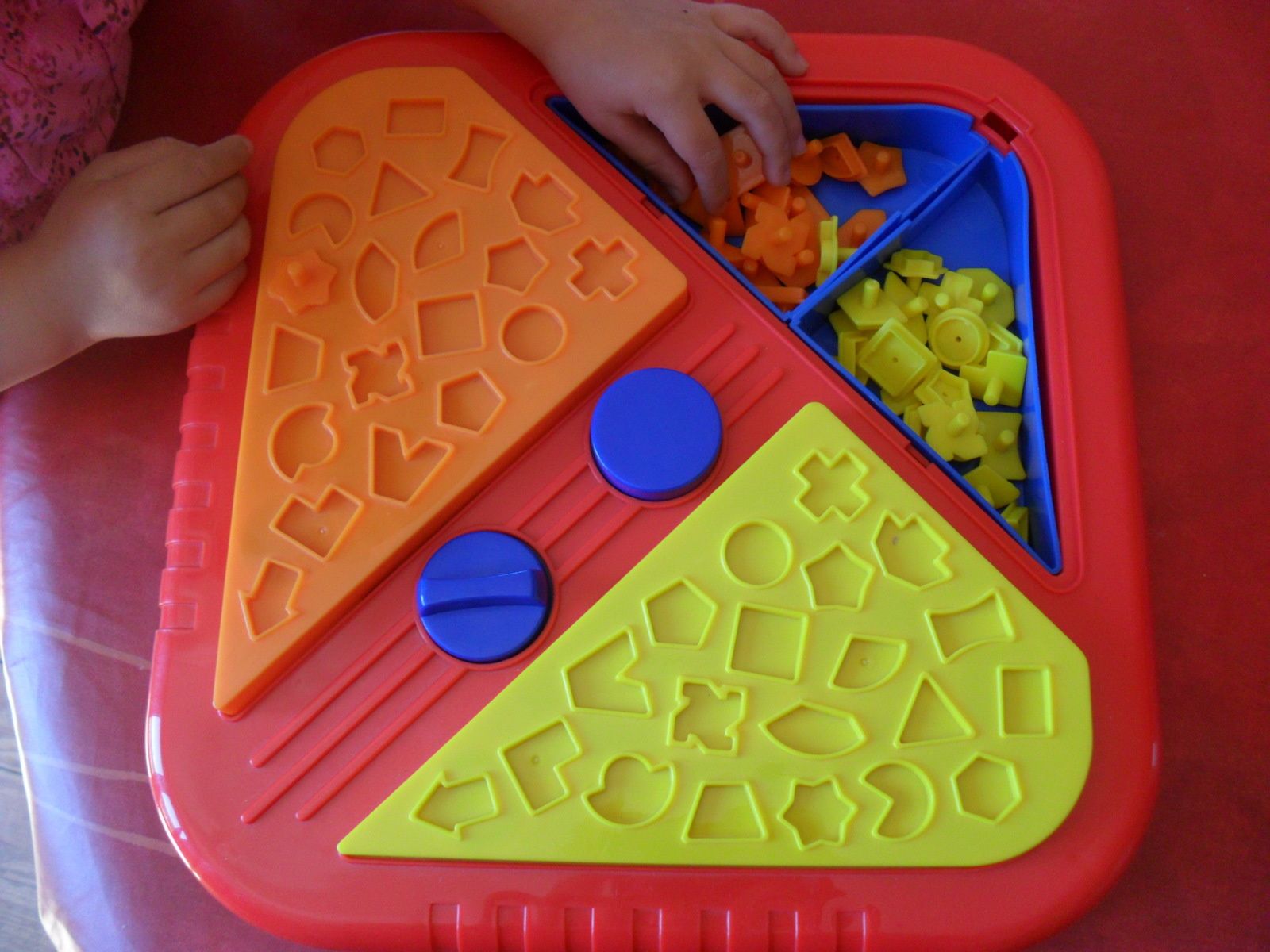 - Un jeu d'encastrement de formes géométriques (je ne me souviens plus du nom...) que les enfants adorent : le bouton bleu est un chronomètre, les formes sont éjectées si elles ne sont pas toutes posées à temps.
